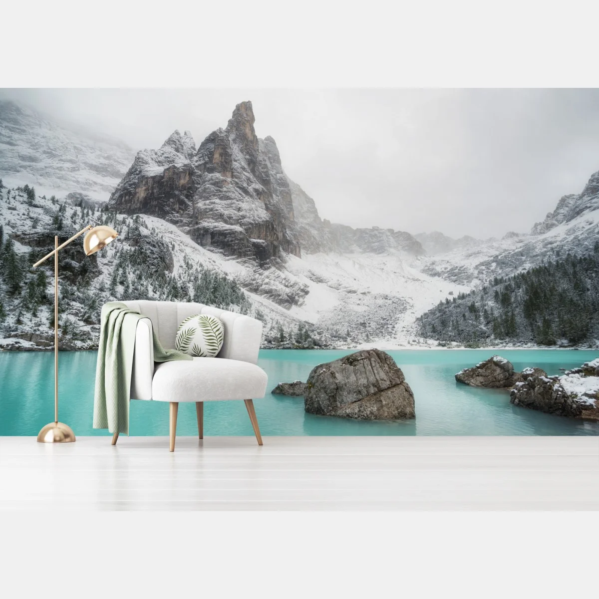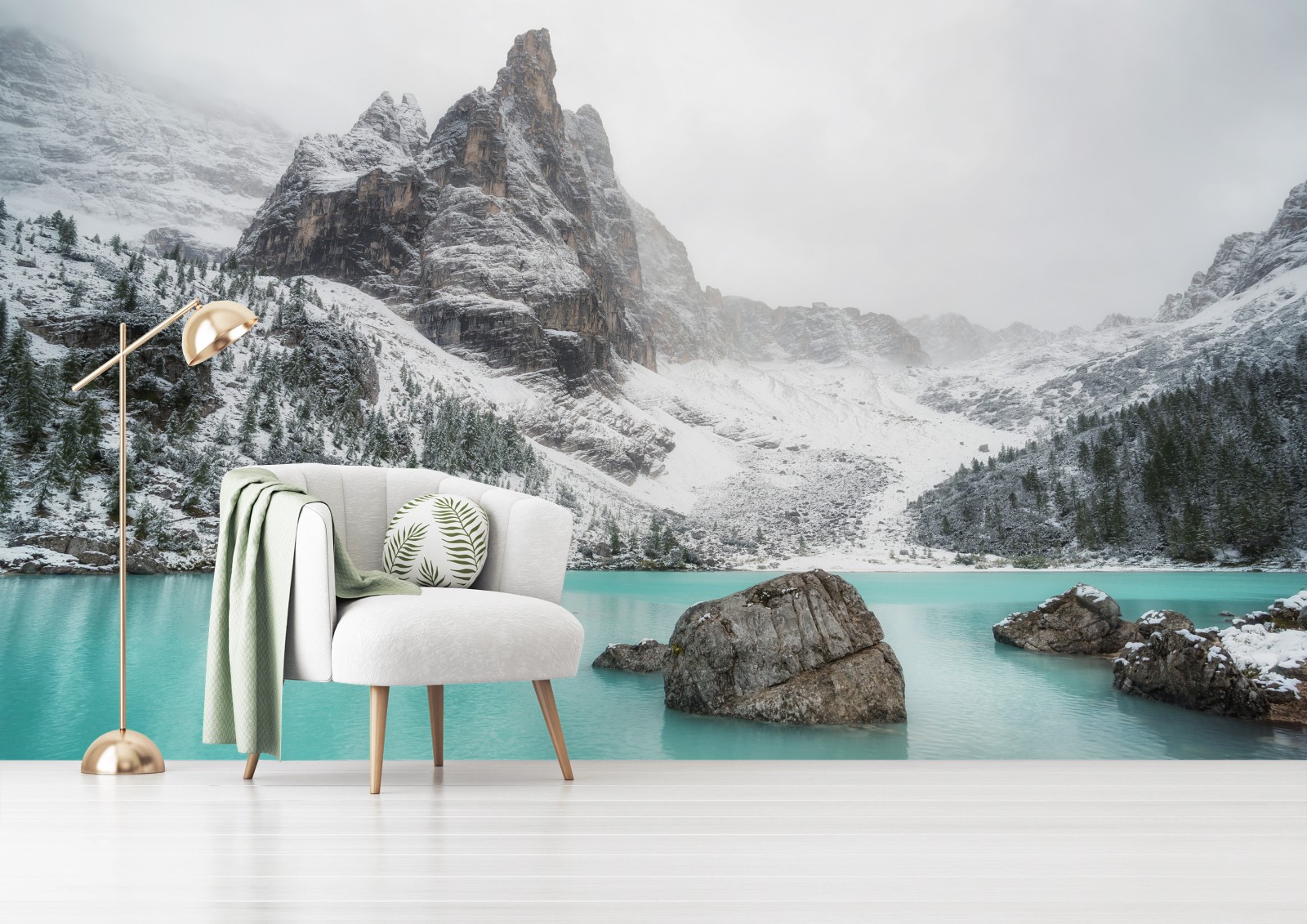 Fototapete Türkissee in alpiner landschaft unter schneebedeckten gipfeln