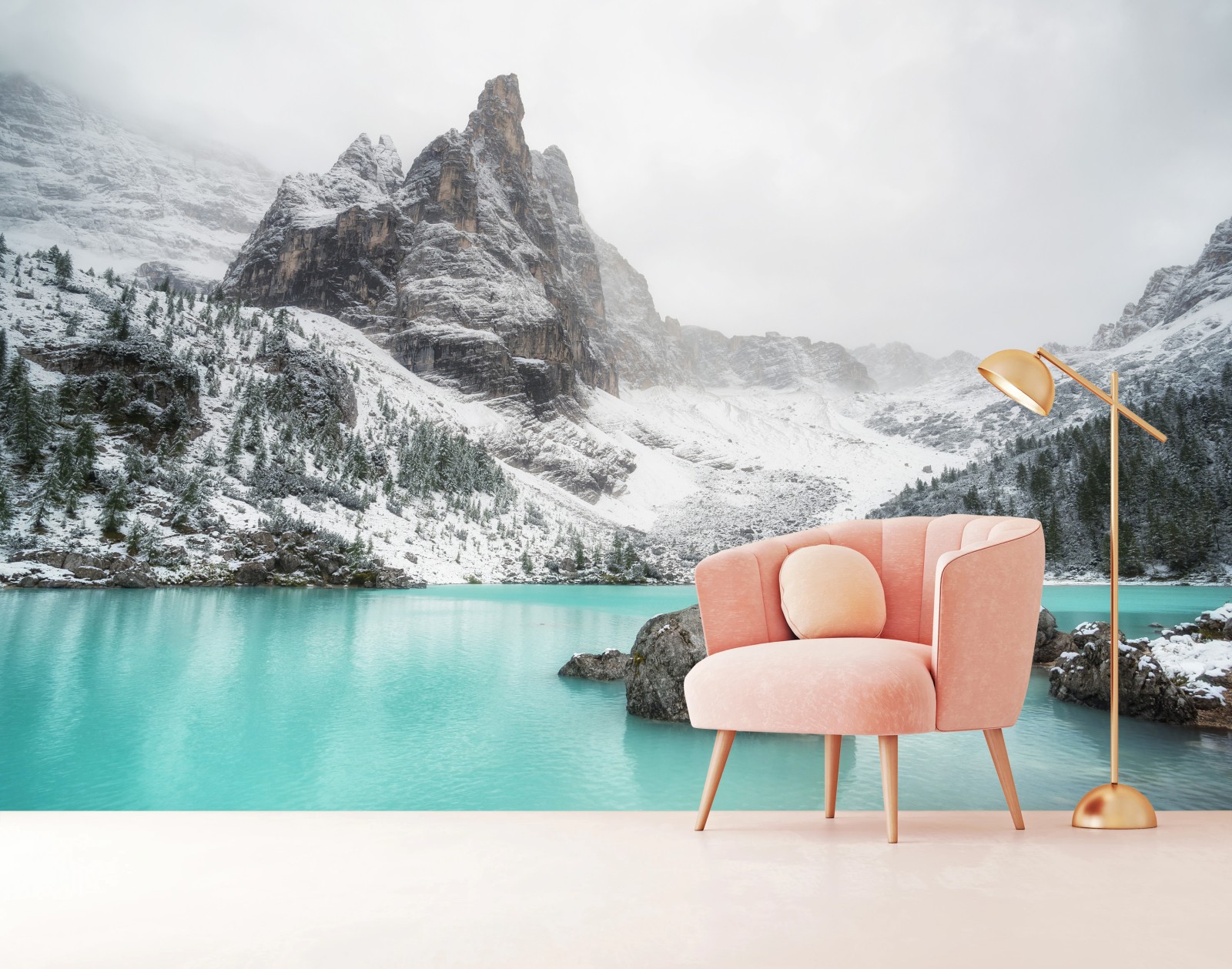 Fototapete Türkissee in alpiner landschaft unter schneebedeckten gipfeln