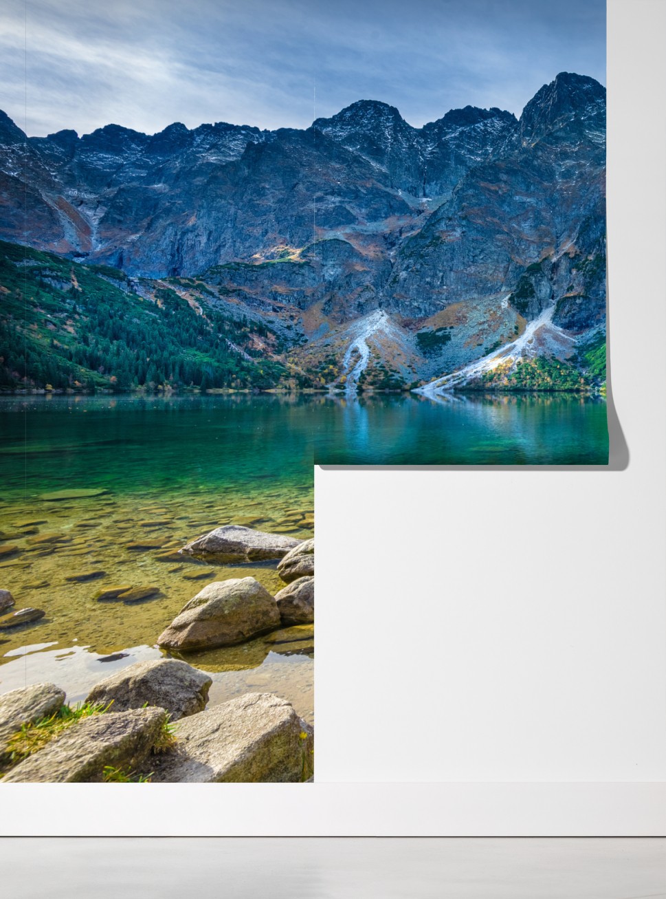 Bringen Sie die ruhige Schönheit von Morskie Oko in Ihr Zuhause mit diesem Bild von smaragdgrünem Wasser, felsiger Uferzone und majestätischen Gipfeln.