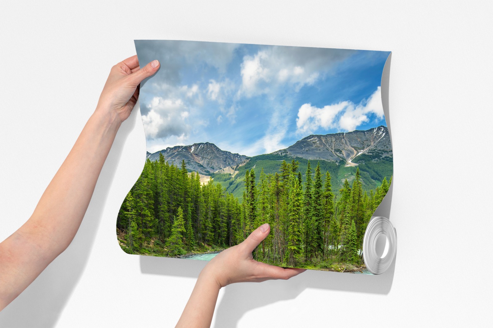 Langzeitaufnahme eines von Gletschern gespeisten Wasserfalls, der durch eine bewaldete Bergschlucht fließt und jedem Raum beruhigende Naturatmosphäre verleiht.