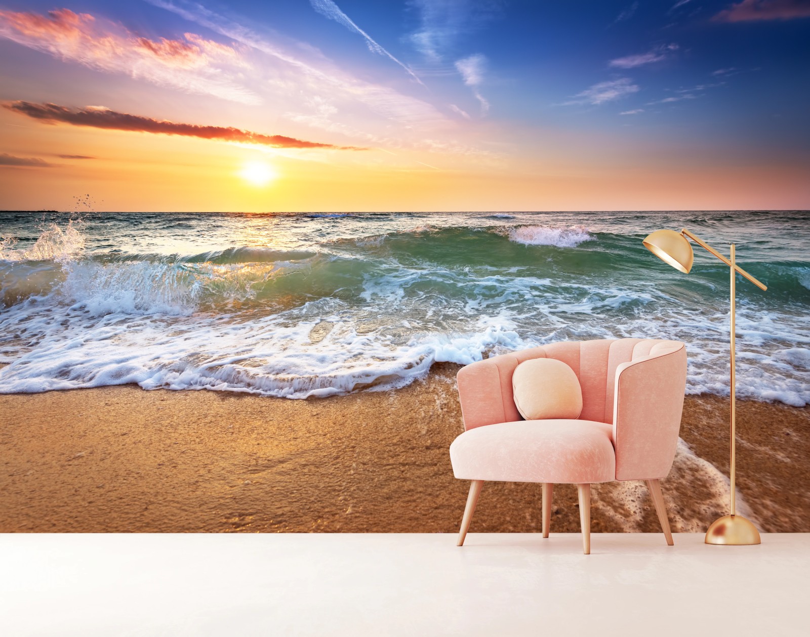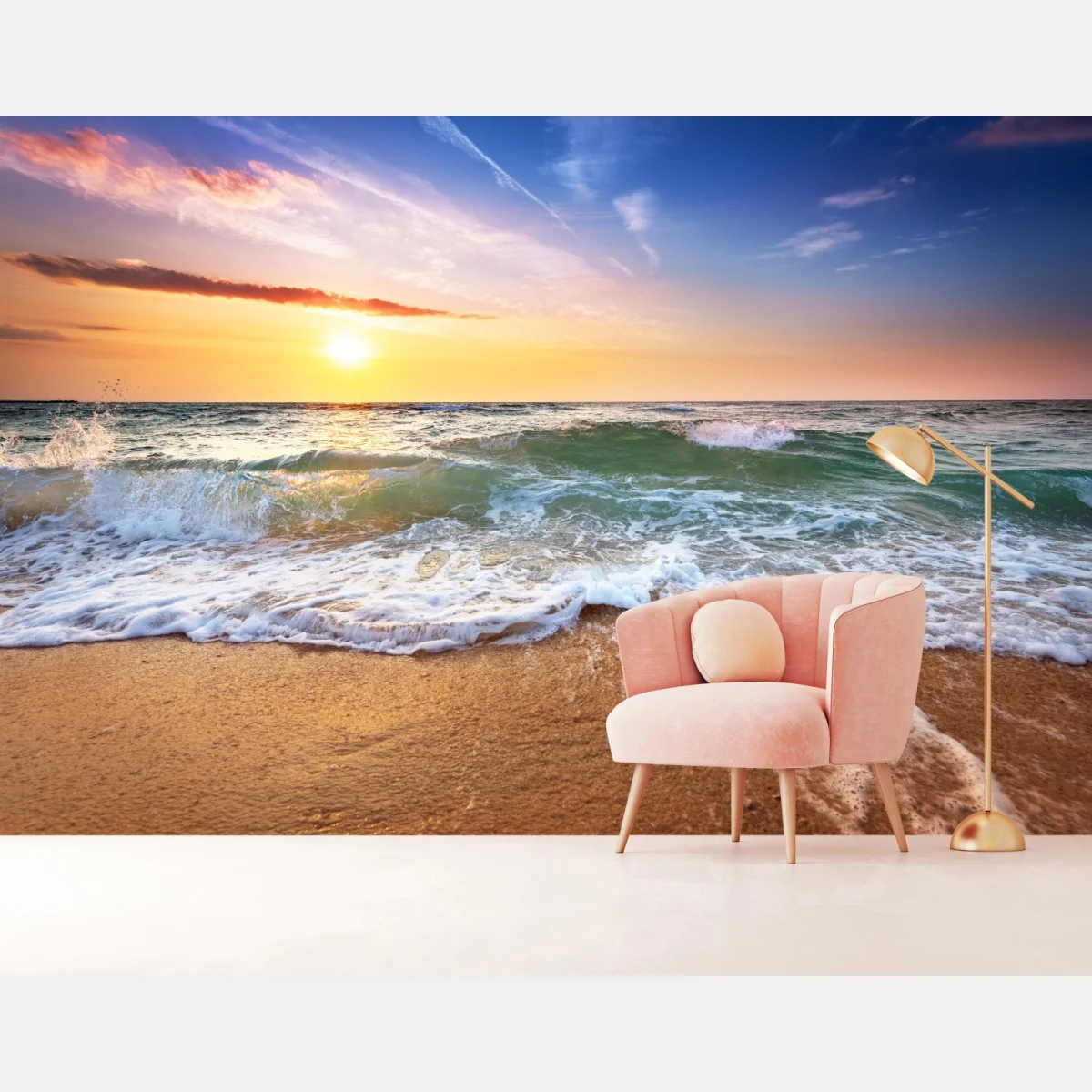Fototapete Goldener sonnenuntergang am strand mit sanften wellen
