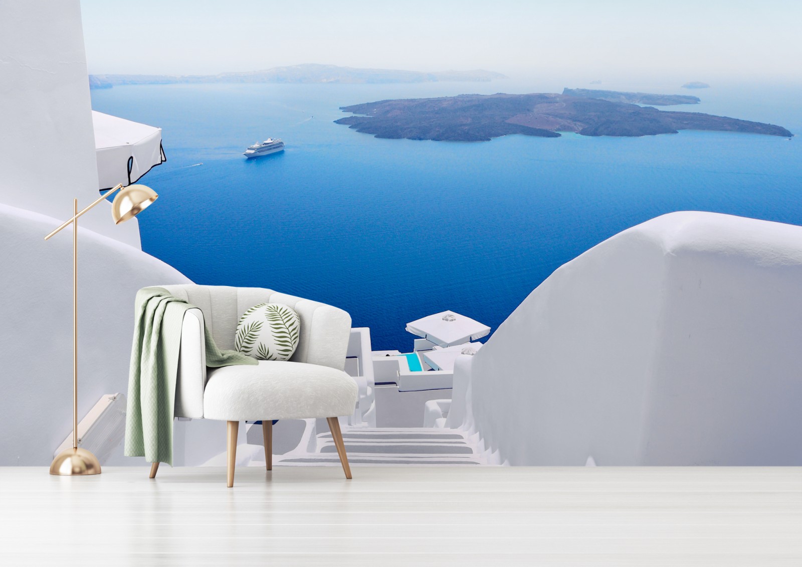 Atemberaubender Blick auf Santorini mit weißer Architektur und tiefblauem Meer, ideal zur Verstärkung eines mediterranen Ambientes.