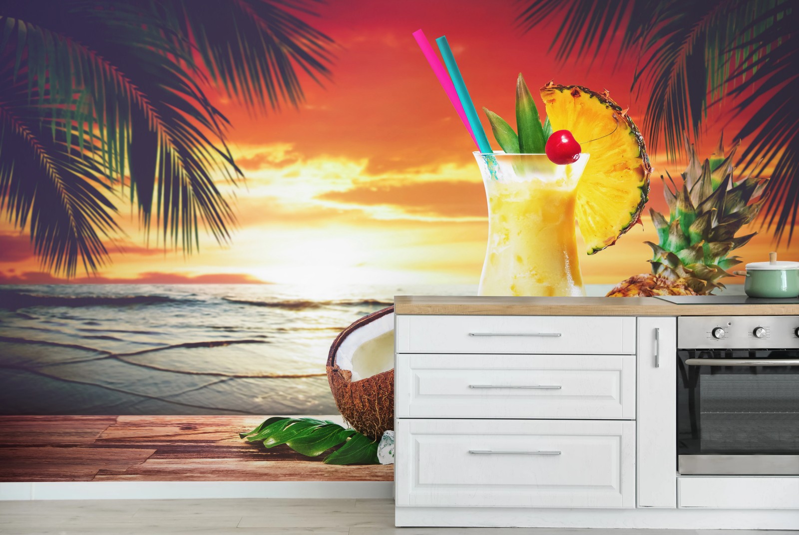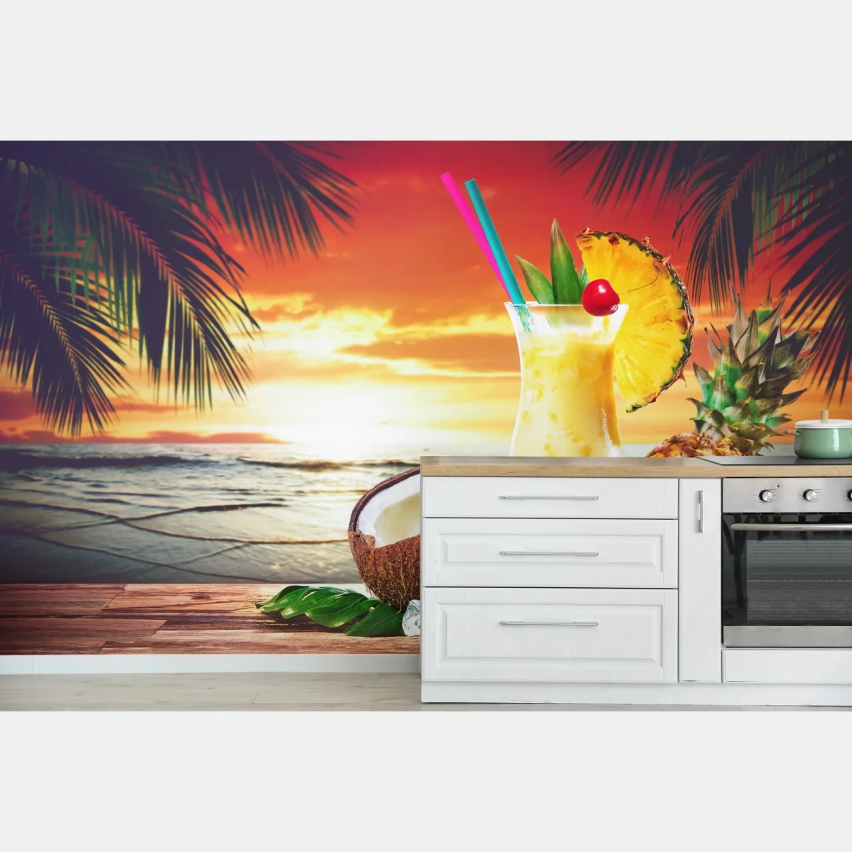 Lebendige tropische Szene mit erfrischendem Cocktail, frischer Ananas und Kokosnuss vor einem goldenen Strandsonnenuntergang, perfekt um sommerliches Flair in jeden Raum zu bringen.MehrWeniger