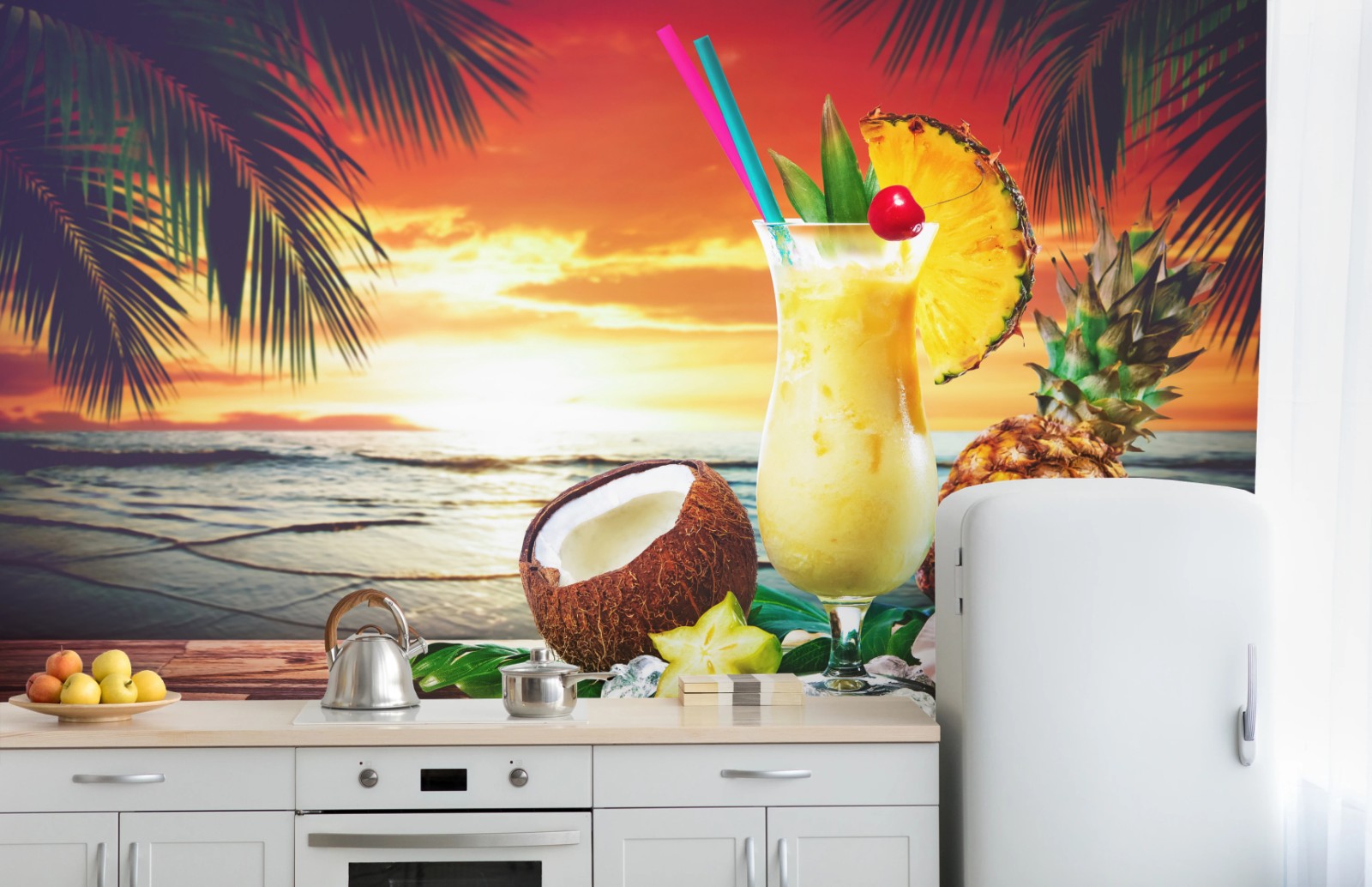 Fototapete Tropischer kokos-ananas-cocktail am strand bei sonnenuntergang