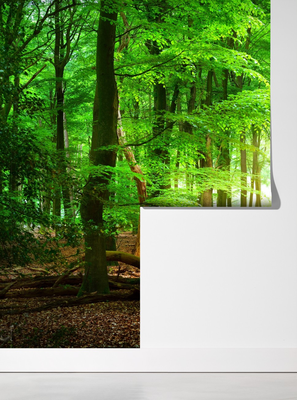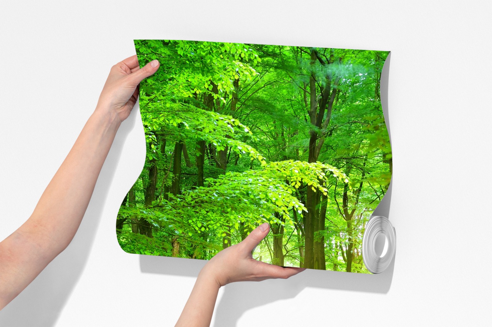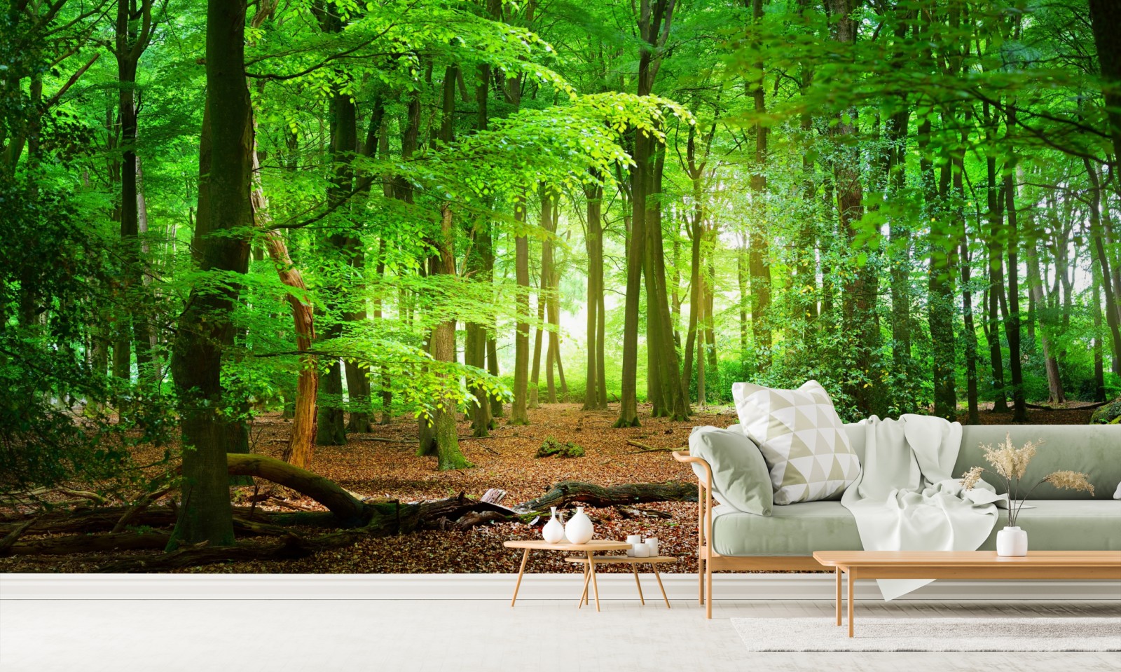 Eine sonnendurchflutete Waldszene, die beruhigende Grüntöne und natürliche Atmosphäre in jeden Raum bringt.