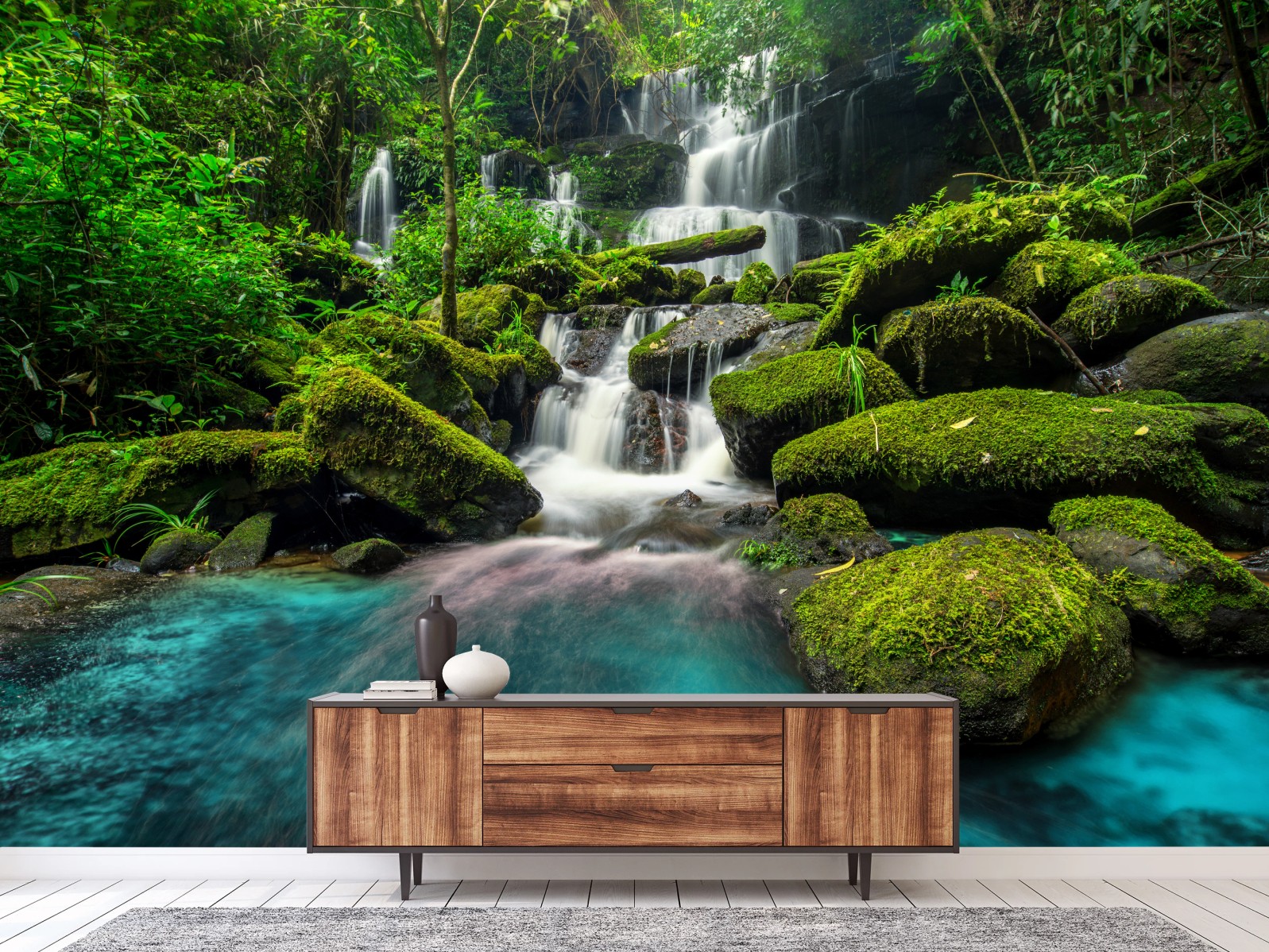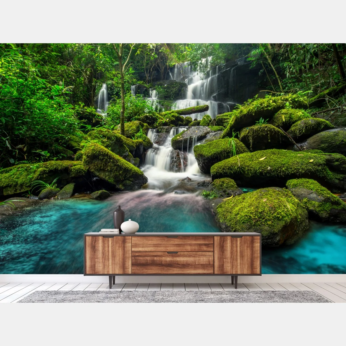 Bringen Sie Ruhe und natürliche Energie in Ihr Zuhause mit dieser lebendigen Szene von fallendem Wasser und üppigem Moos aus Phu Tub Berk, Thailand.MehrWeniger
