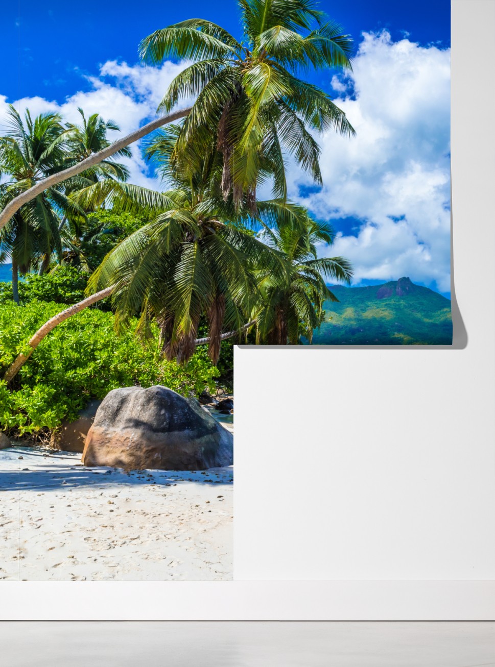 Bringen Sie die beruhigende Schönheit von Baie Beau Vallon in Ihr Zuhause mit dieser lebendigen tropischen Strandaufnahme mit türkisfarbenem Wasser, wiegenden Palmen und sonnenverwöhntem Sand.
