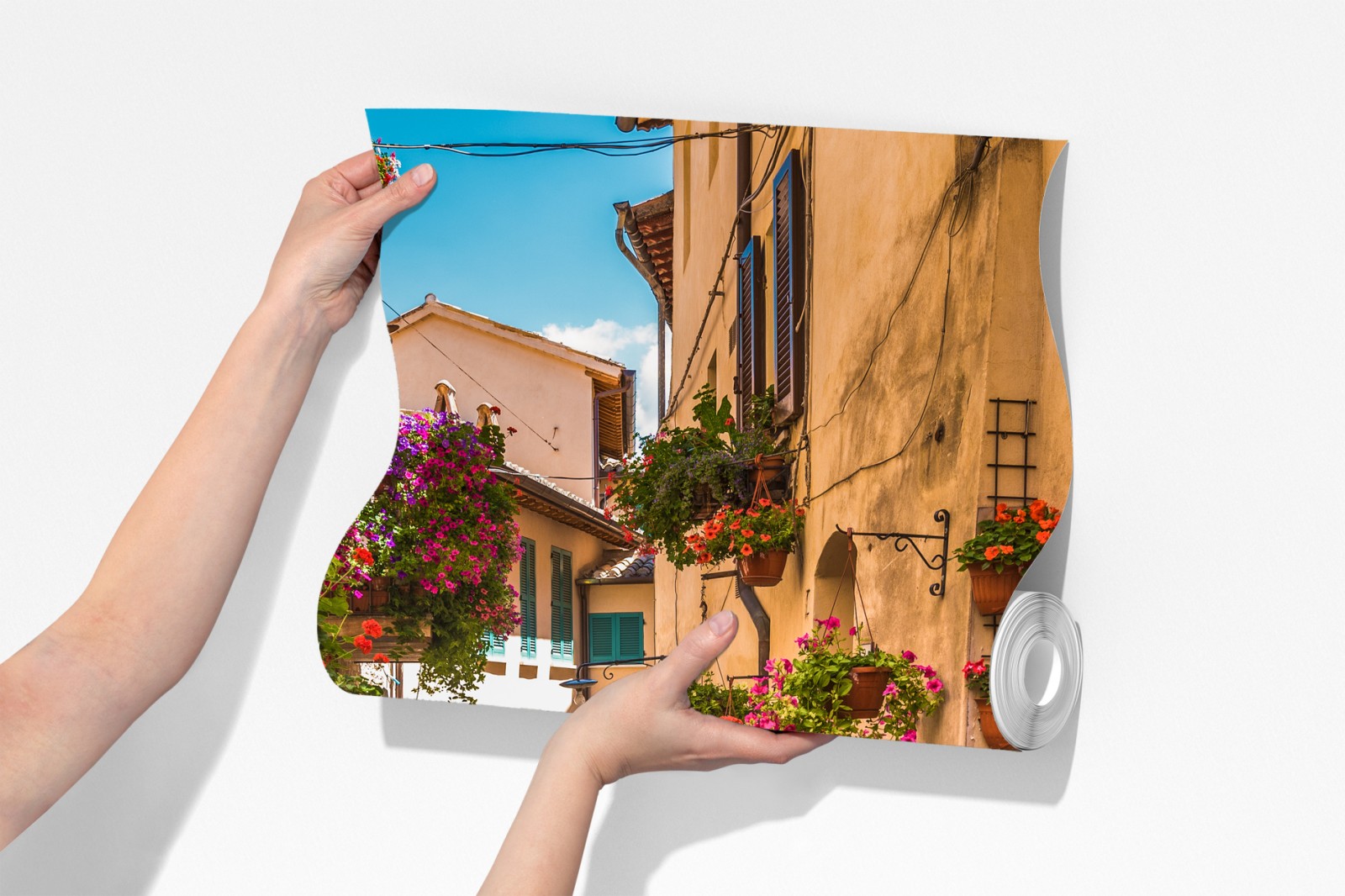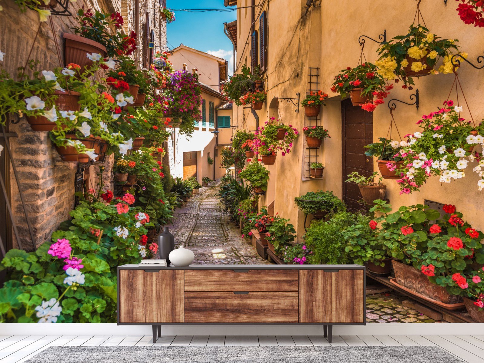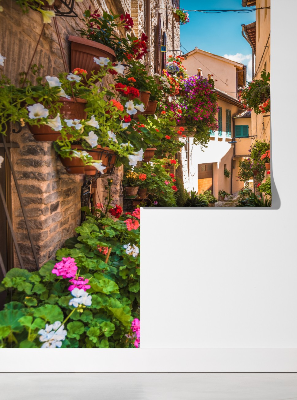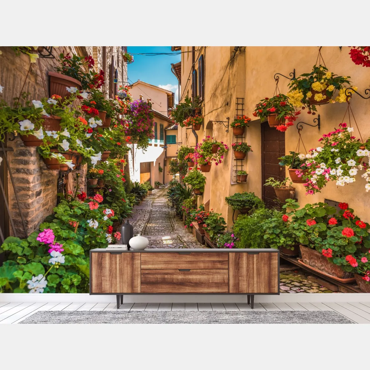 Bringen Sie den Charme einer umbrischen Blumengasse in Ihr Zuhause mit diesem bunten, sonnigen Straßenmotiv, das Wärme und rustikalen Charakter verleiht.