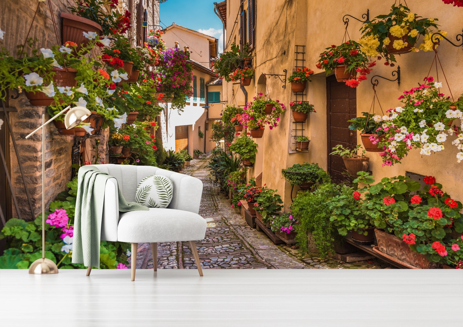 Bringen Sie den Charme einer umbrischen Blumengasse in Ihr Zuhause mit diesem bunten, sonnigen Straßenmotiv, das Wärme und rustikalen Charakter verleiht.MehrWeniger