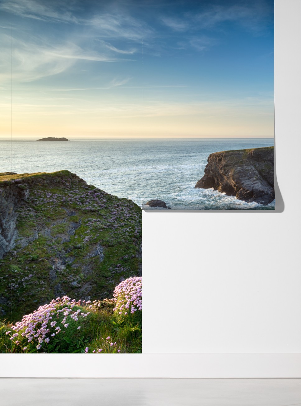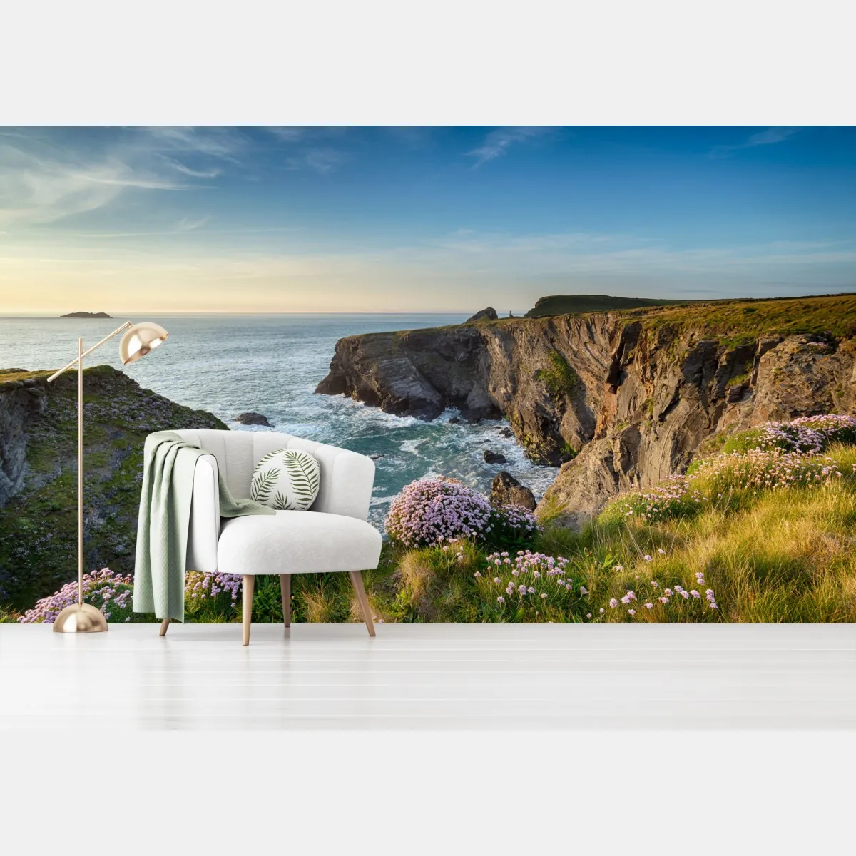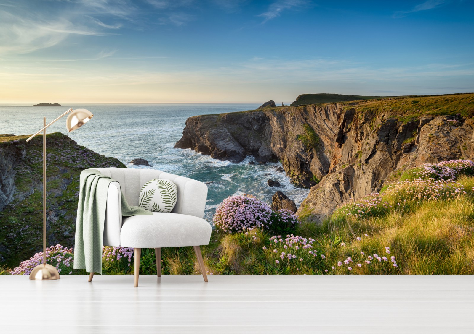 Atemberaubende Küstenklippen mit Wildblumen im Vordergrund, fotografiert in der goldenen Stunde, um ruhige natürliche Schönheit in Ihren Raum zu bringen.