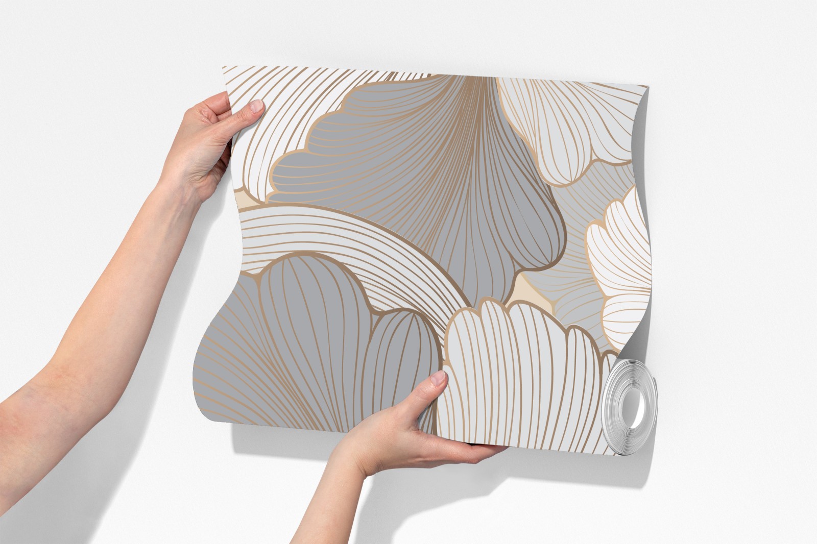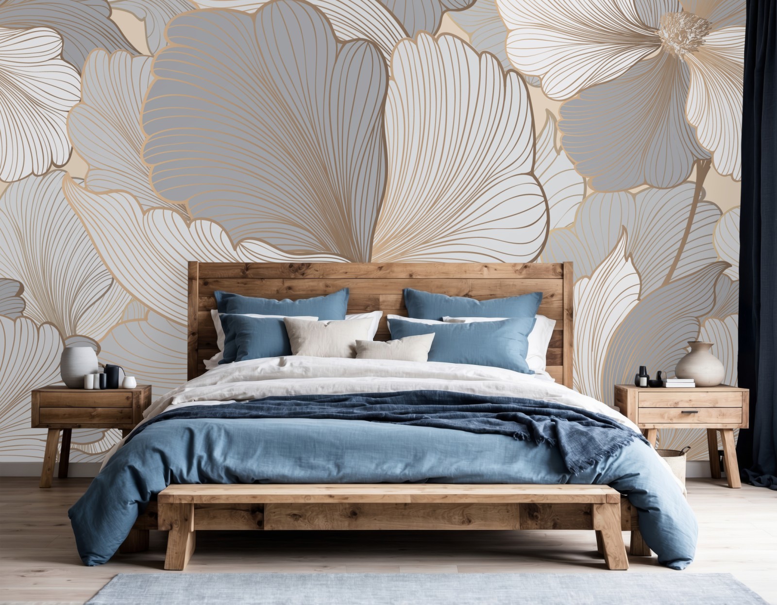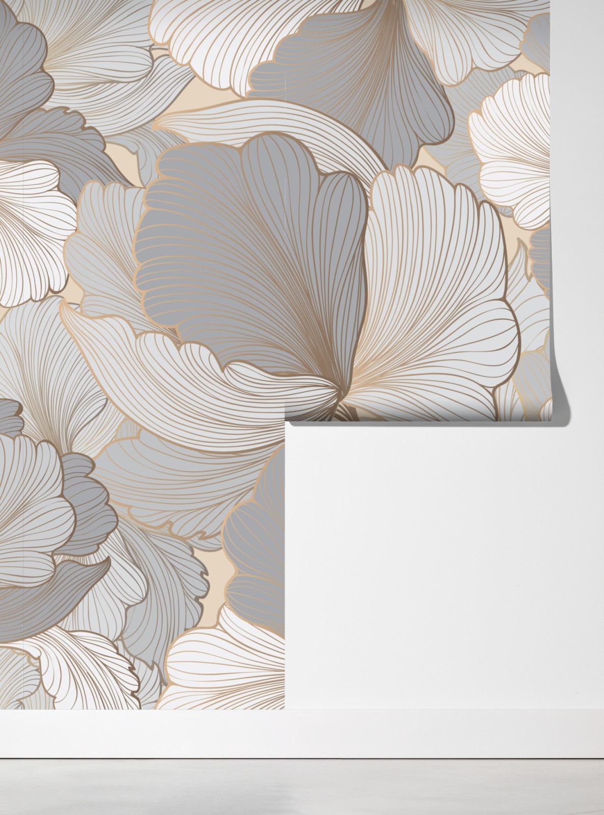 Sanfte Pastellblumen in neutralen Beige- und Grautönen mit feinen goldenen Linien verleihen jedem Raum elegante Ruhe.