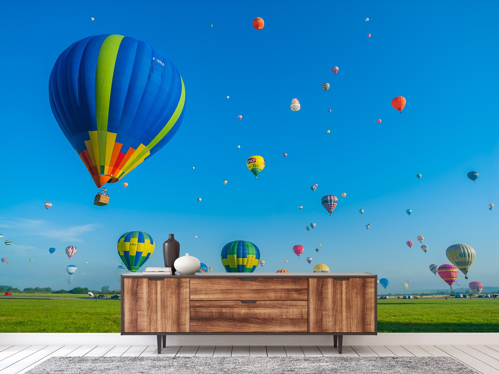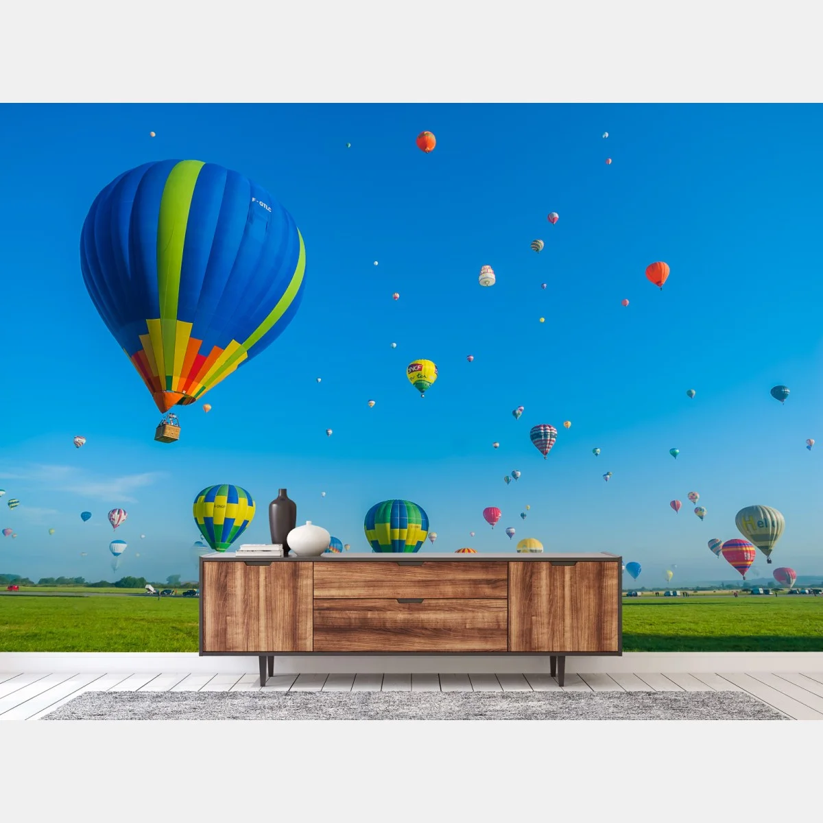 Lebendige Panoramaaufnahme mehrfarbiger Heißluftballons über grünen Feldern unter klarem blauem Himmel, ideal zum Aufhellen jeder Wand.MehrWeniger