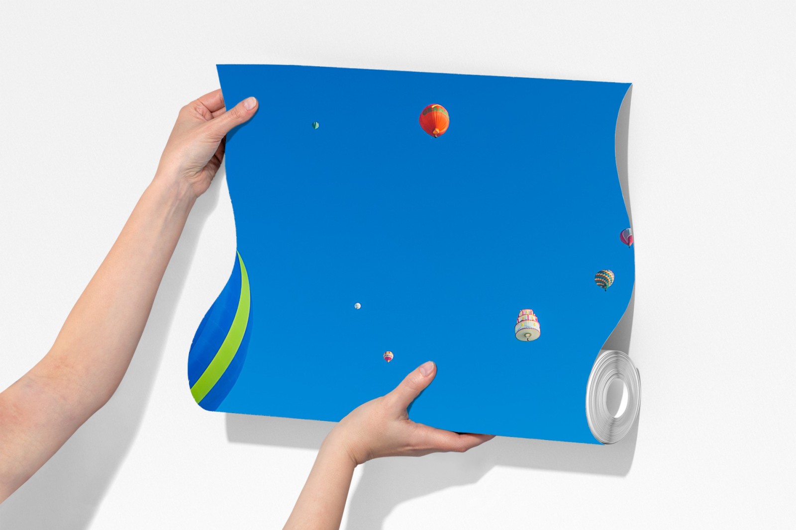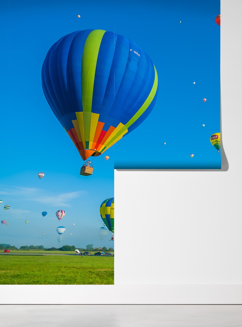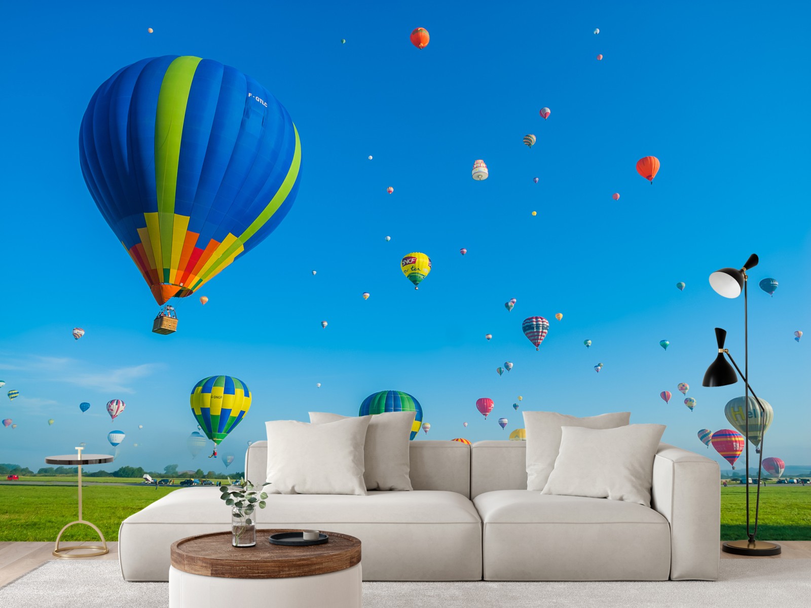Lebendige Panoramaaufnahme mehrfarbiger Heißluftballons über grünen Feldern unter klarem blauem Himmel, ideal zum Aufhellen jeder Wand.