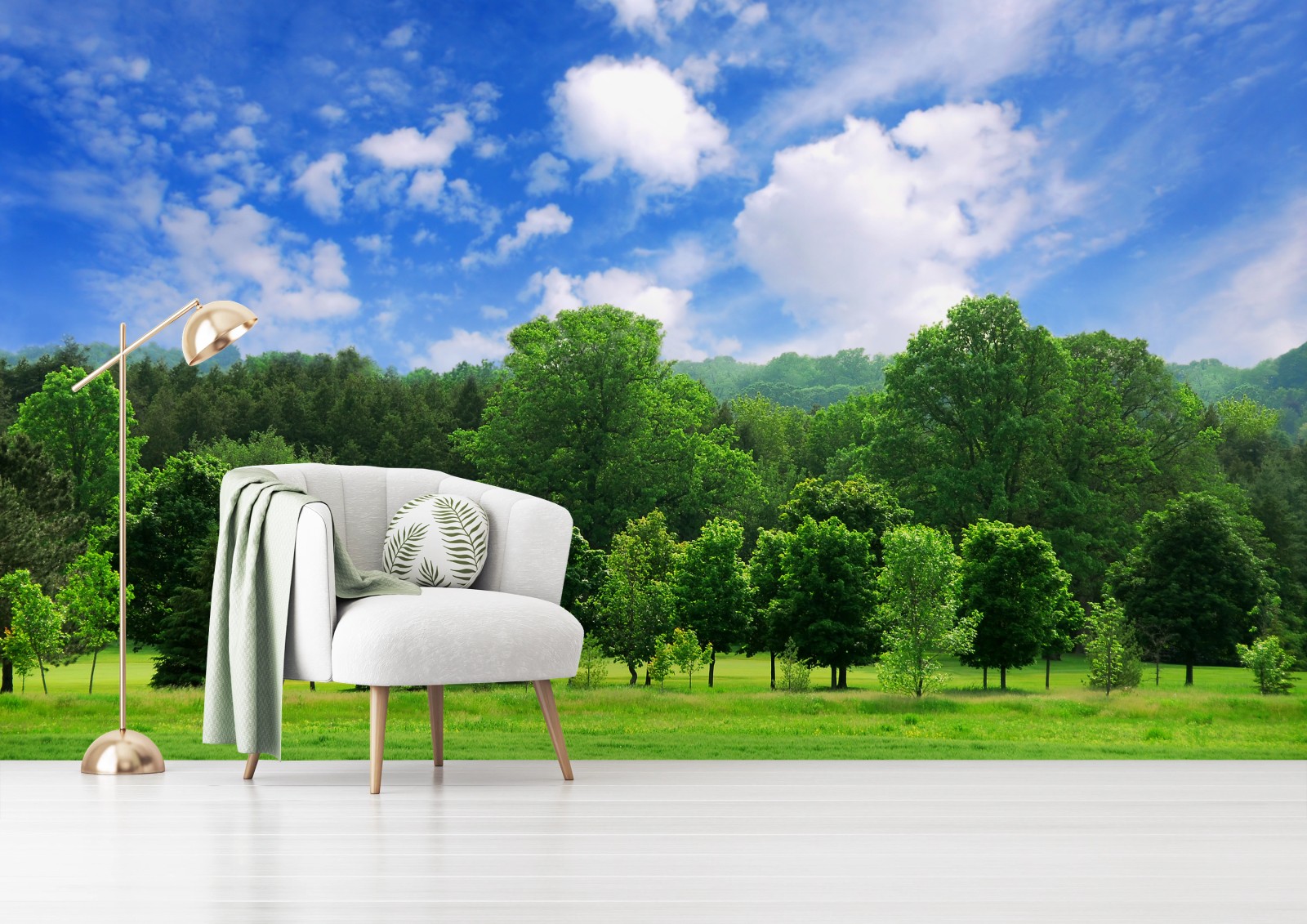 Fototapete Sommerlicher grüner wald unter blauem himmel