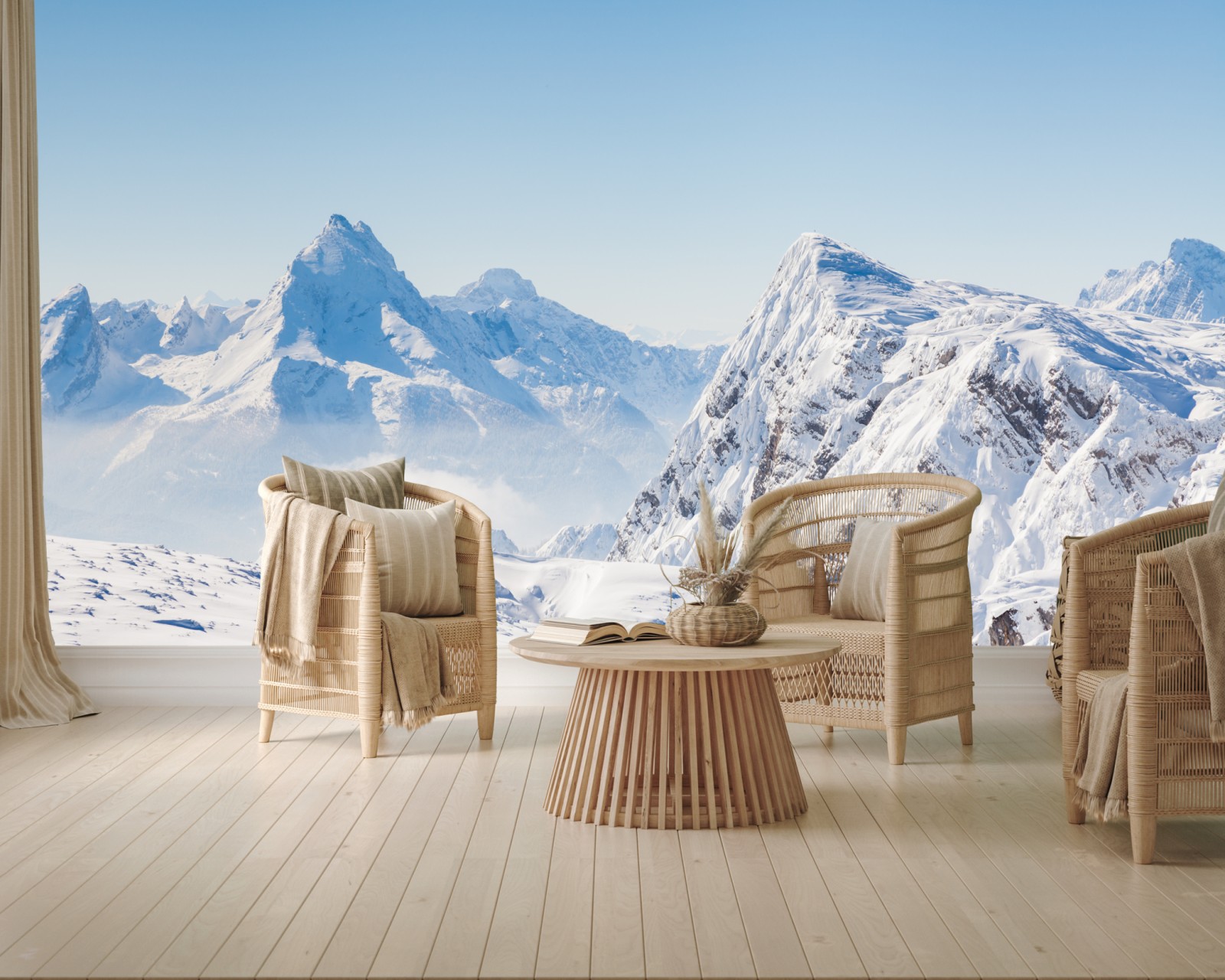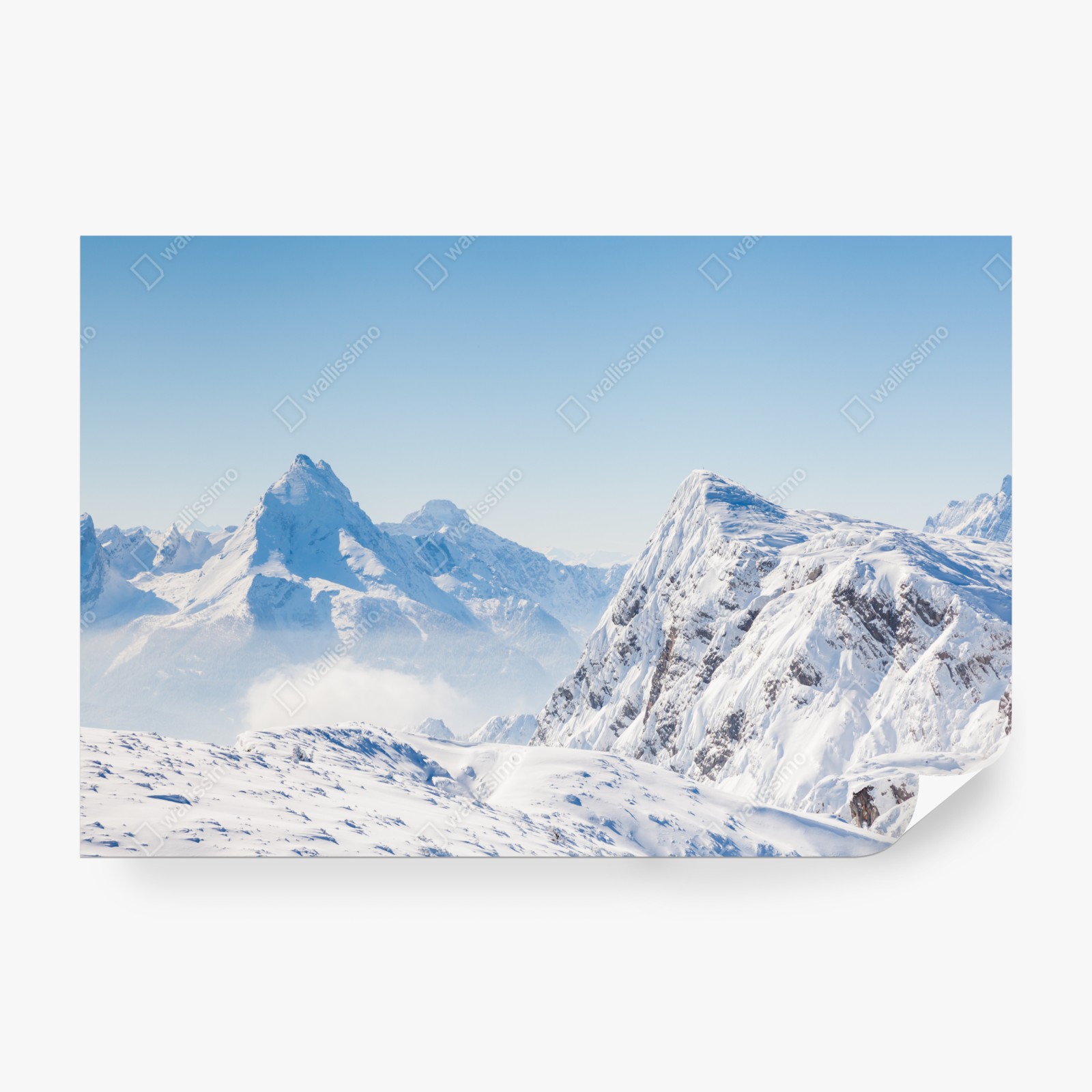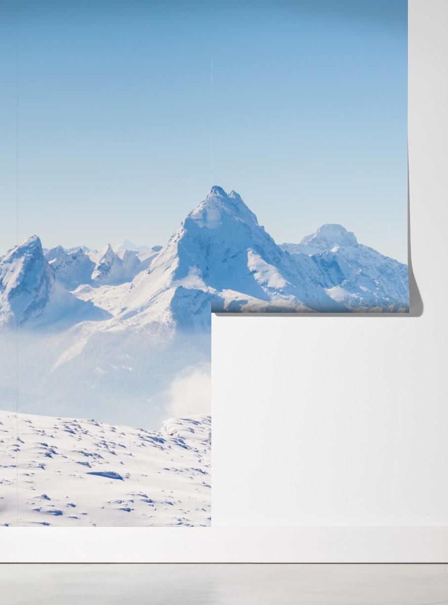 Ein ruhiges Panorama verschneiter Berge bringt frische, alpine Atmosphäre und Weite an Ihre Wände.