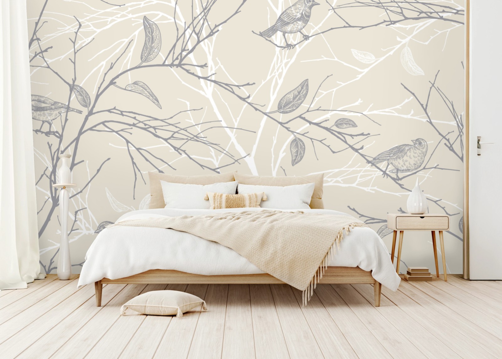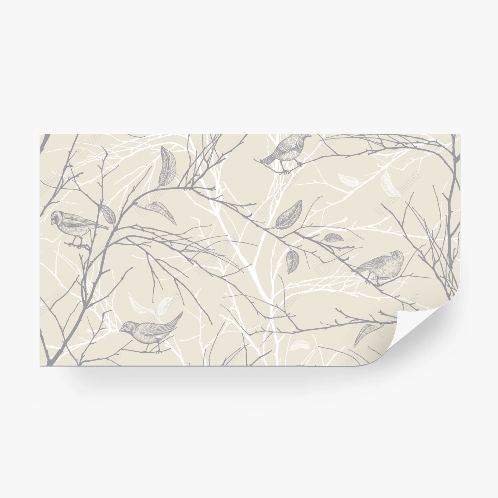 Fototapete Zartes beiges muster mit vögeln und ästen
