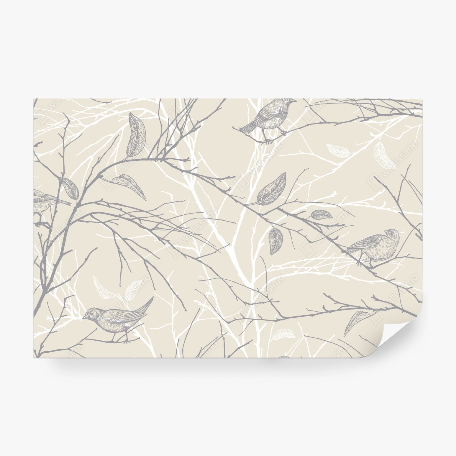 zartes muster mit vögeln und ästen in einer dezenten beige-grauen palette, das eine ruhige, natürliche atmosphäre schafft.MehrWeniger