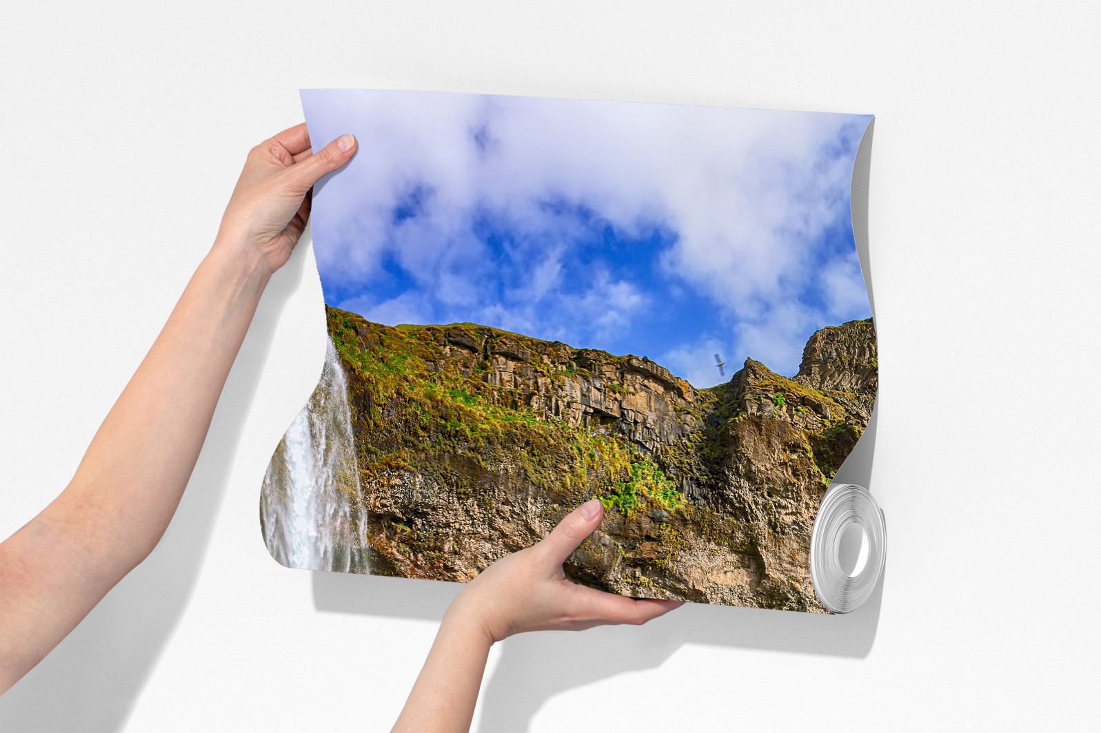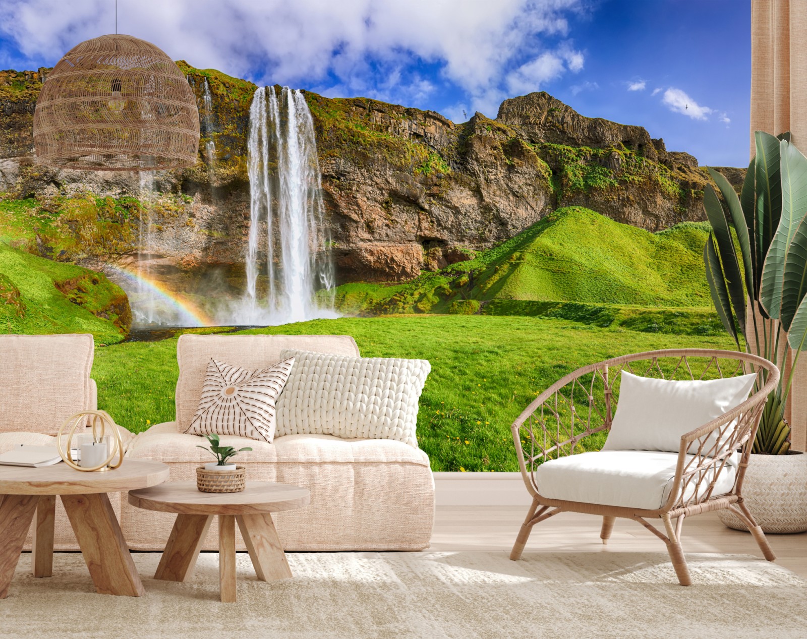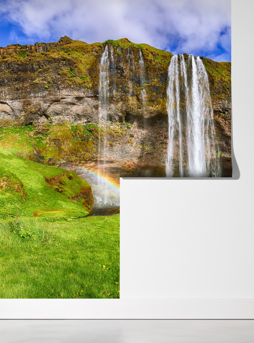 Atemberaubender Blick auf den Wasserfall Seljalandsfoss mit satten grünen Klippen und einem leuchtenden Regenbogen, perfekt um Natur in Ihr Zuhause zu bringen.