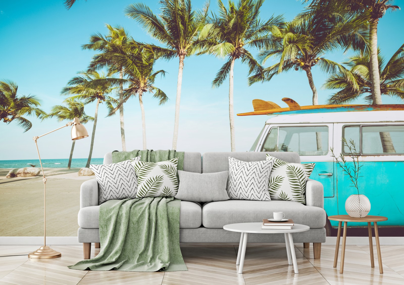 Sonnenverwöhntes Retro-Motiv mit einem Vintage-Bus und Surfbrett vor Palmen, perfekt um jedem Raum maritimen Charme zu verleihen.
