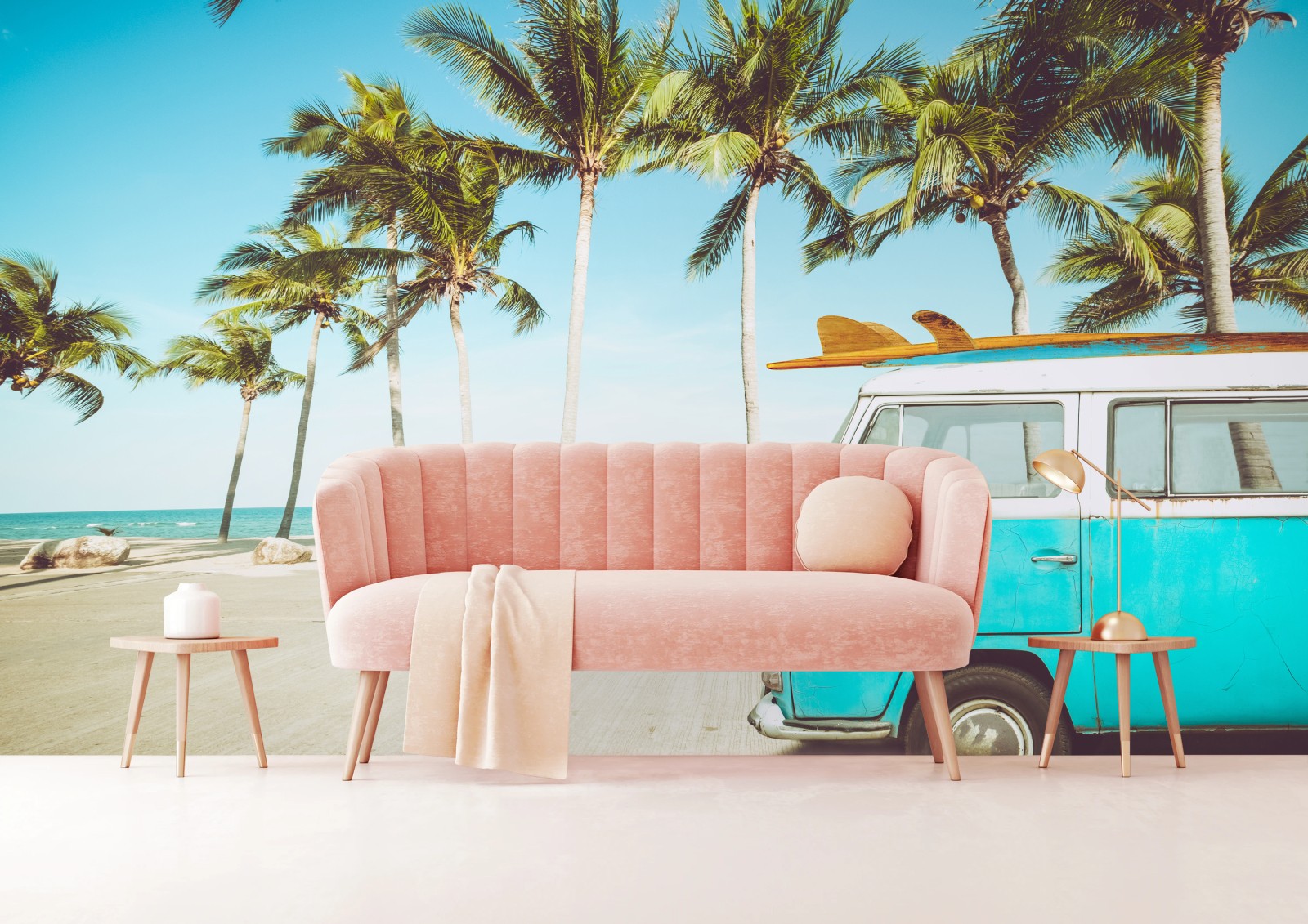 Sonnenverwöhntes Retro-Motiv mit einem Vintage-Bus und Surfbrett vor Palmen, perfekt um jedem Raum maritimen Charme zu verleihen.MehrWeniger