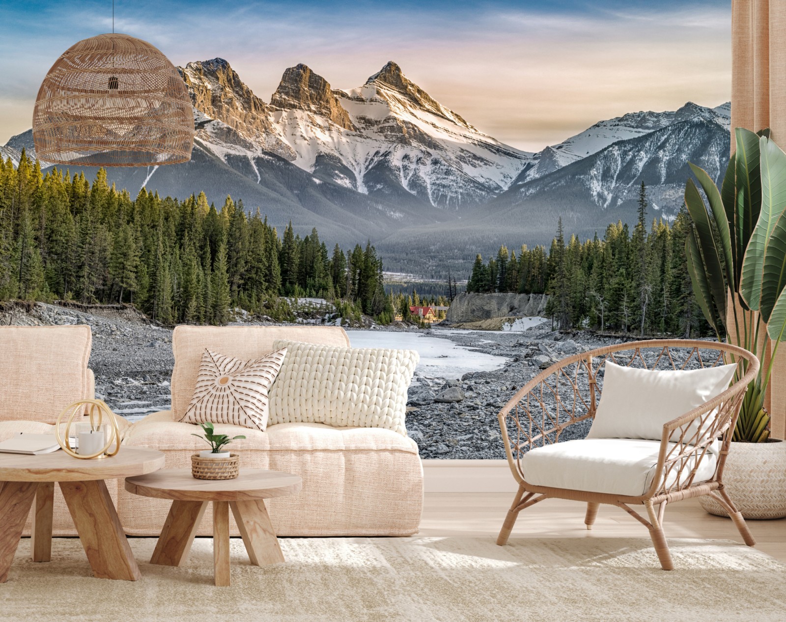 Erleben Sie Ruhe und Größe mit diesem hochauflösenden Berglandschaftsbild mit schneebedeckten Gipfeln, einem ruhigen Flussbett und dichtem Kiefernwald im sanften Morgenlicht.
