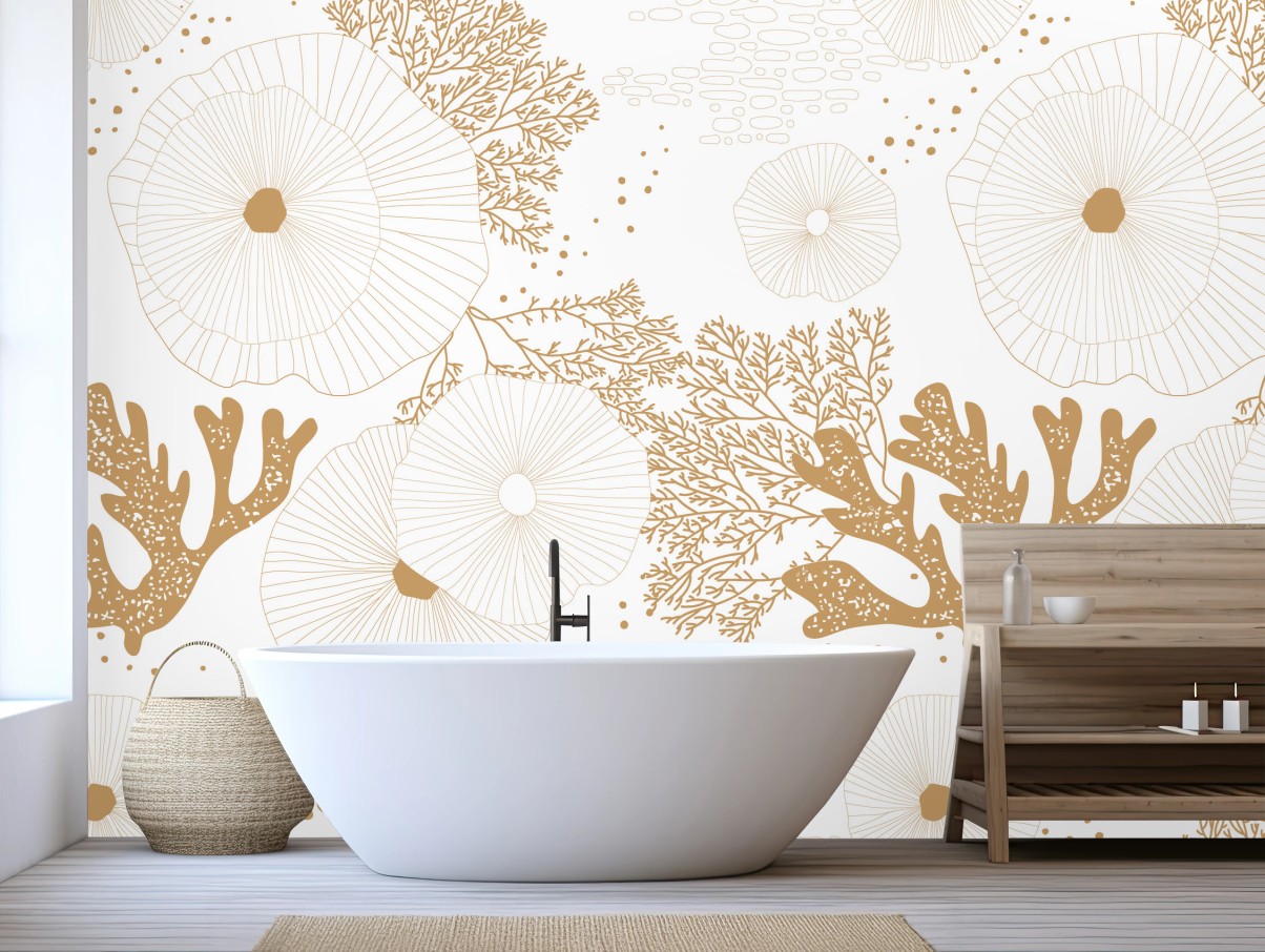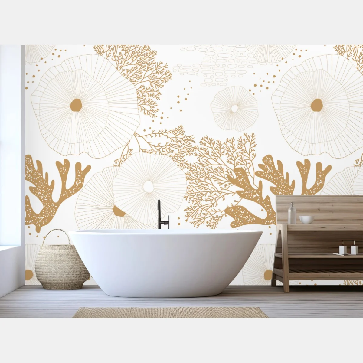 Elegantes, vom Meer inspiriertes Motiv mit feinen goldenen Korallen und Seeanemonen auf klarem weißen Hintergrund, ideal für ruhige Wohnräume.MehrWeniger