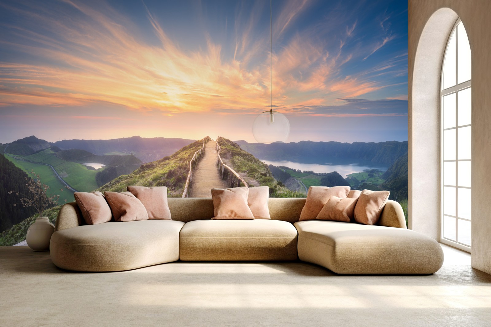 Fototapete sonnenuntergangspfad auf berggrat über see und tal