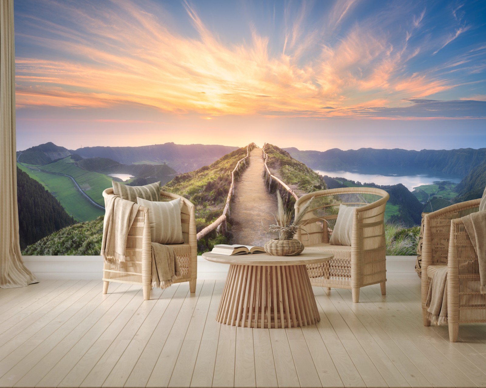 Fototapete Sonnenuntergangspfad auf berggrat über see und tal