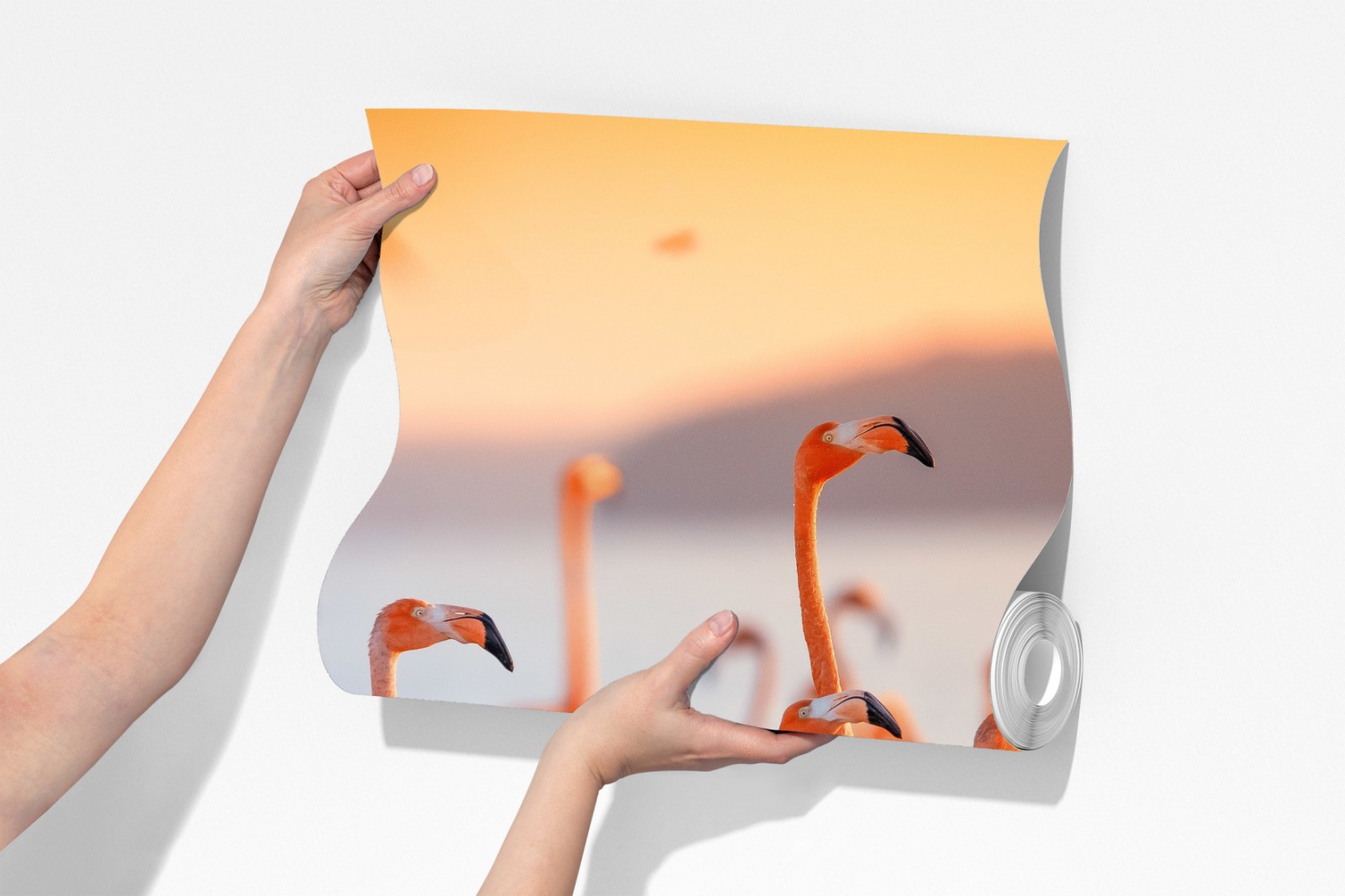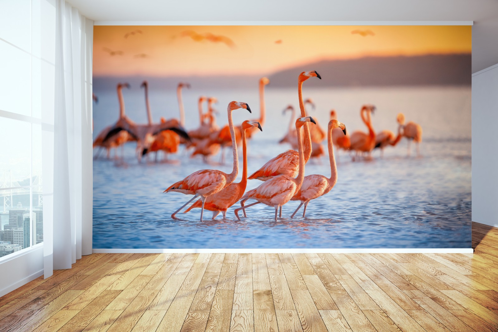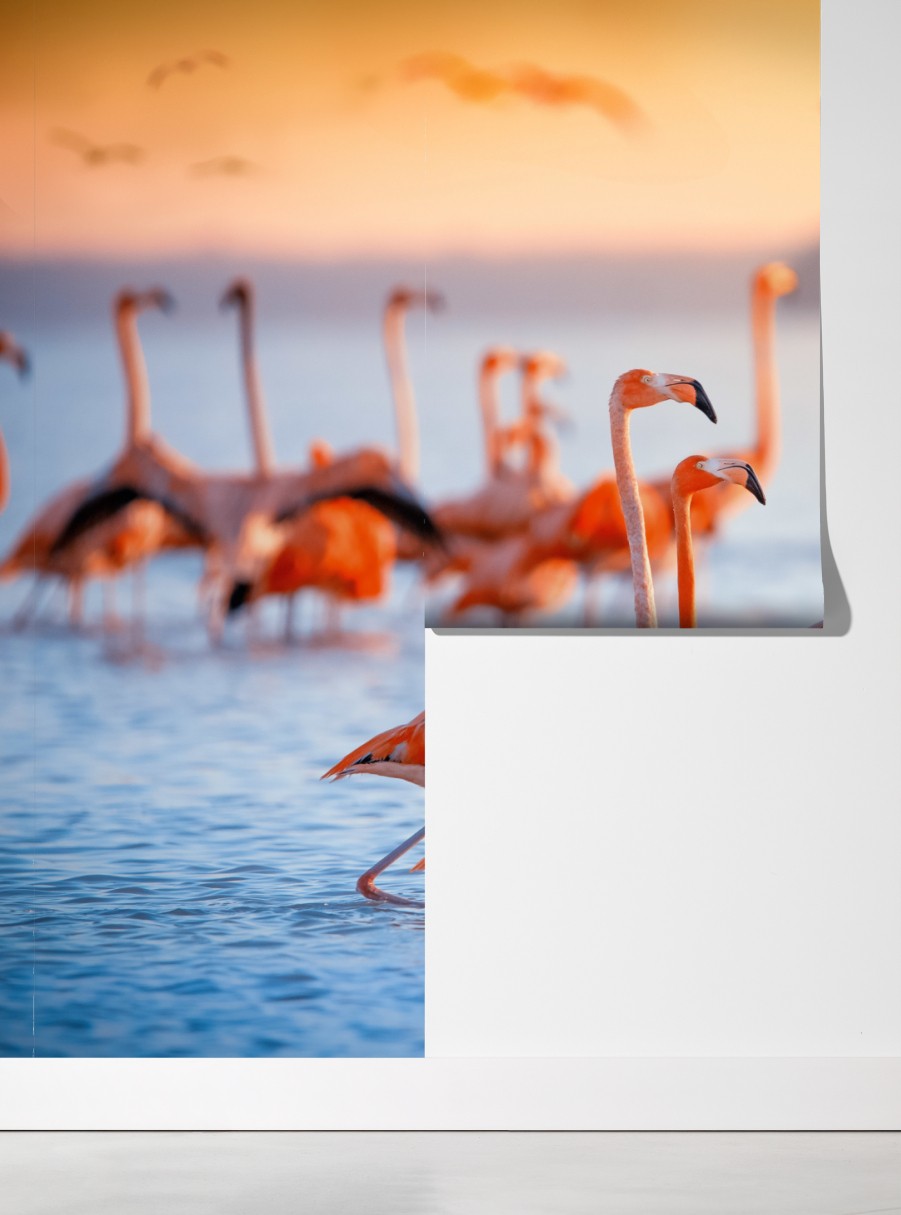 Lebendige Szene rosa Flamingos, die bei Sonnenuntergang im flachen Wasser waten und jedem Raum tropische Wärme und natürliche Eleganz verleihen.