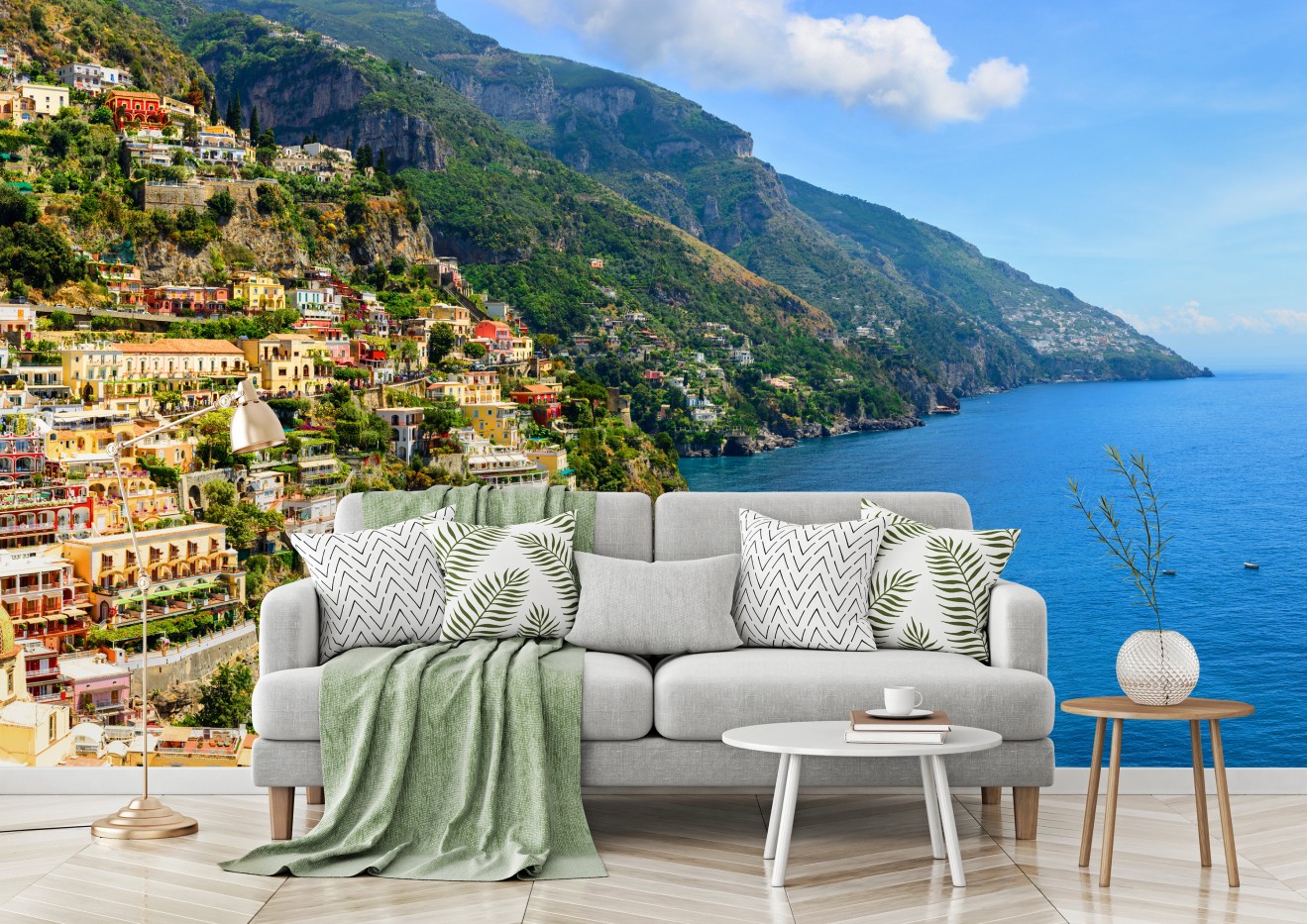 Fototapete Bunte panoramaaufnahme eines küstenortes am hang