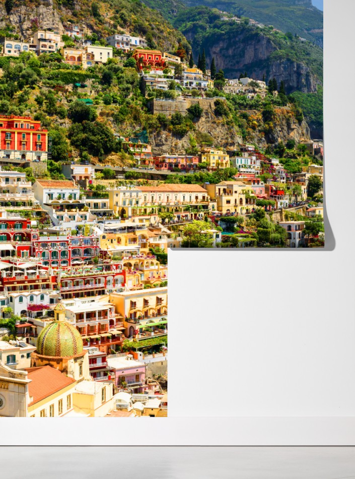 Lebhafte Panoramaaufnahme eines bunten Küstenortes am Felsen, der auf das tiefblaue Meer trifft, ideal um jedem Raum sommerliches Mittelmeerflair zu verleihen.