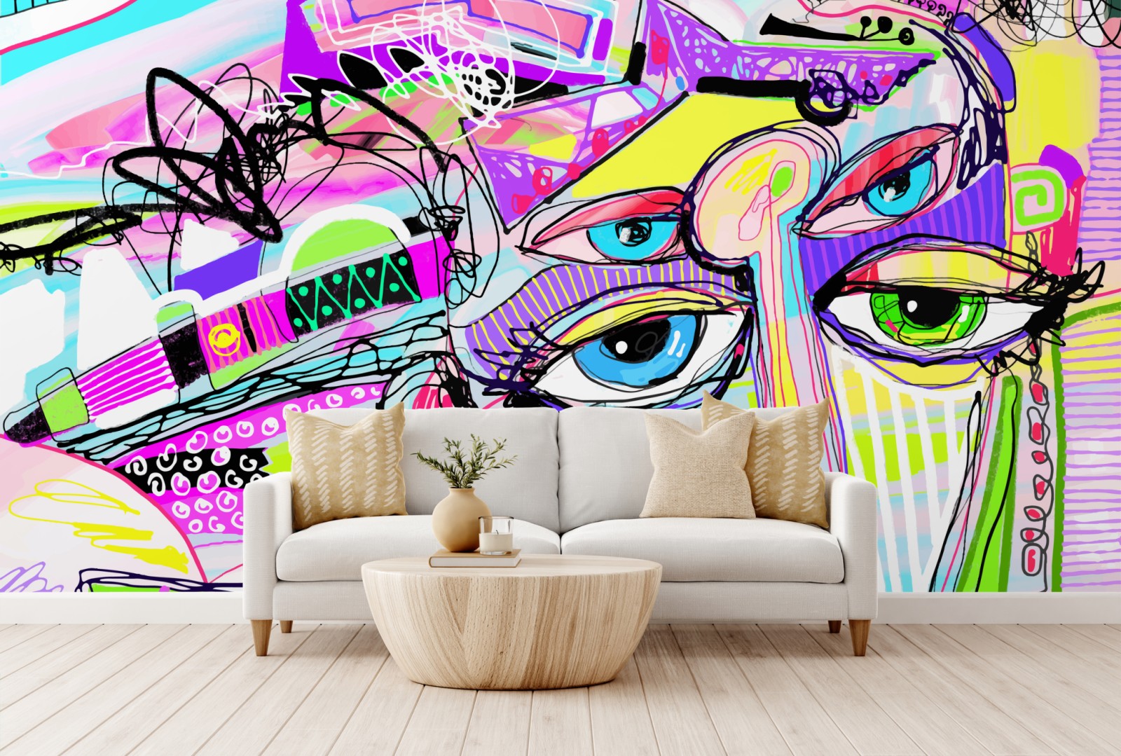 Ein lebhaftes zeitgenössisches abstraktes Porträt mit kräftigen Farben und expressiven Linien, das jedes Interieur belebt.
