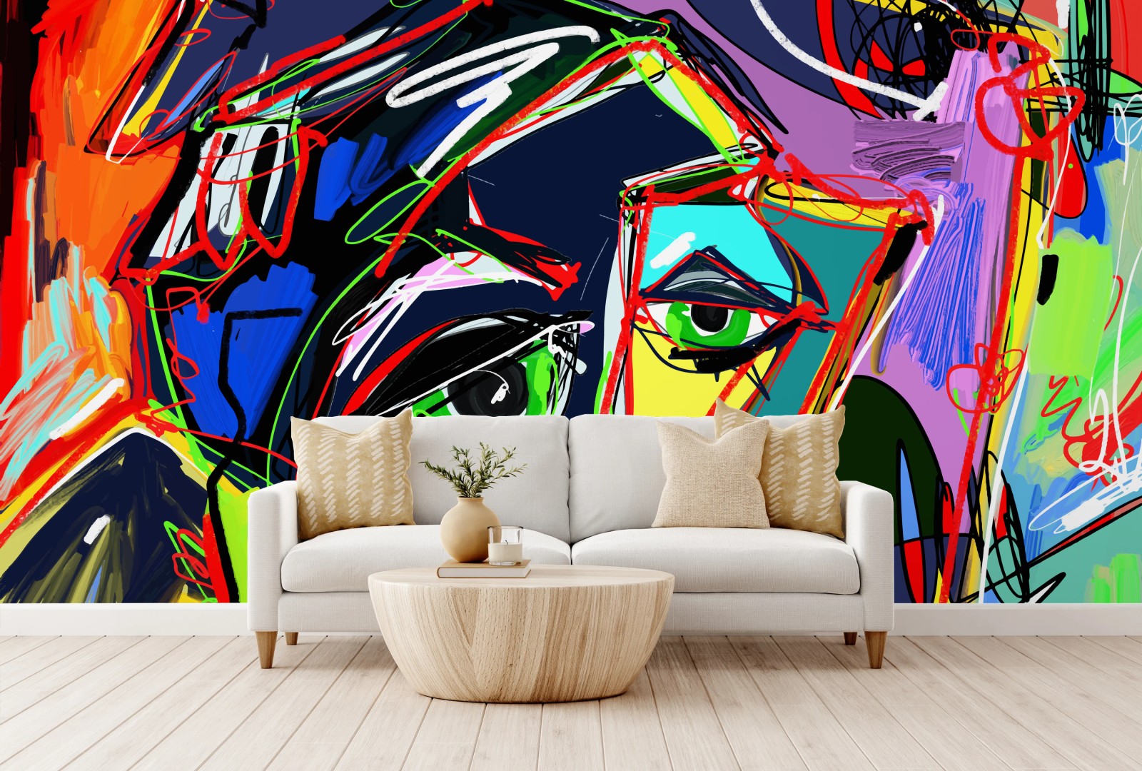 Kräftiges und farbenreiches abstraktes Porträt, das Räume belebt und modernen Ausdruck verleiht.MehrWeniger