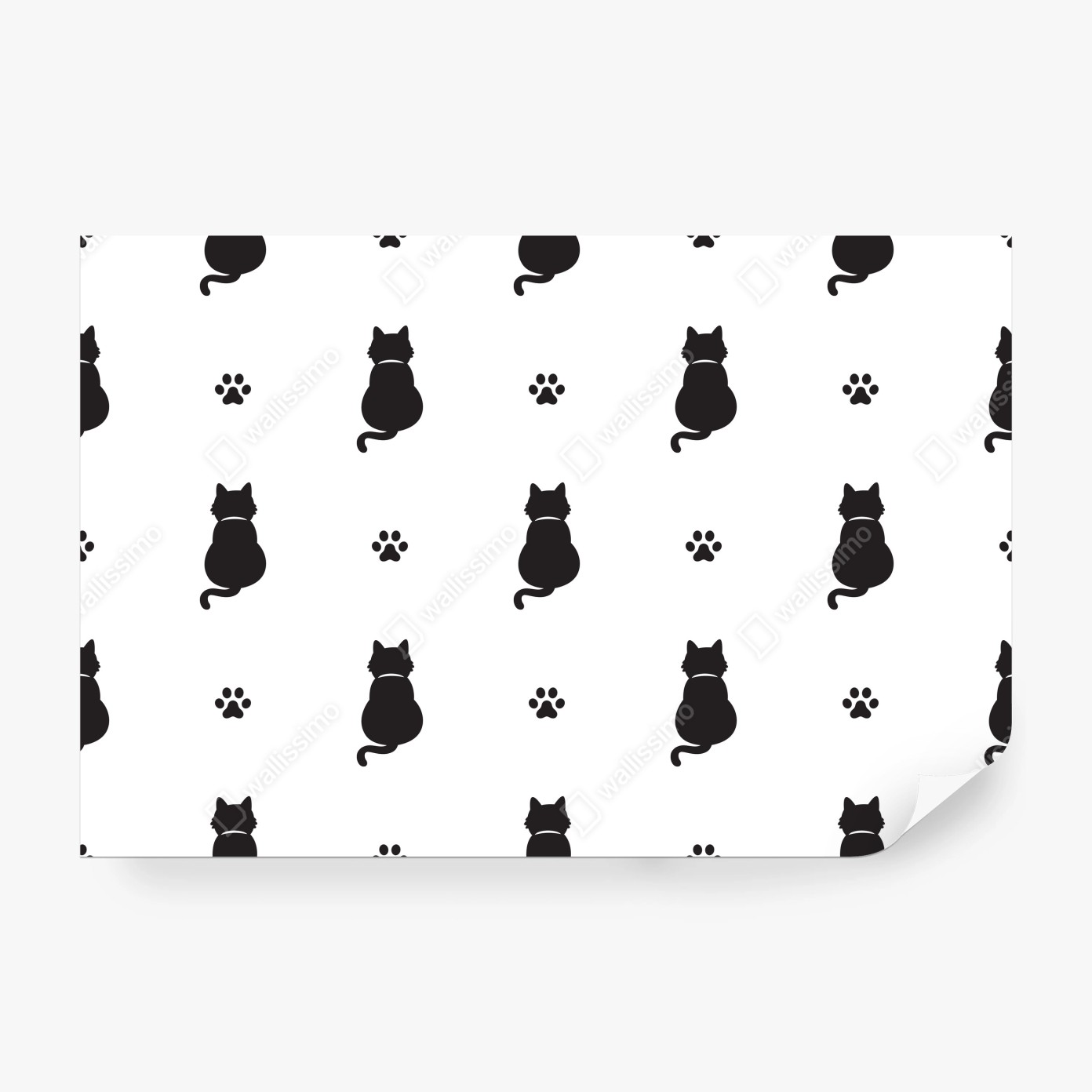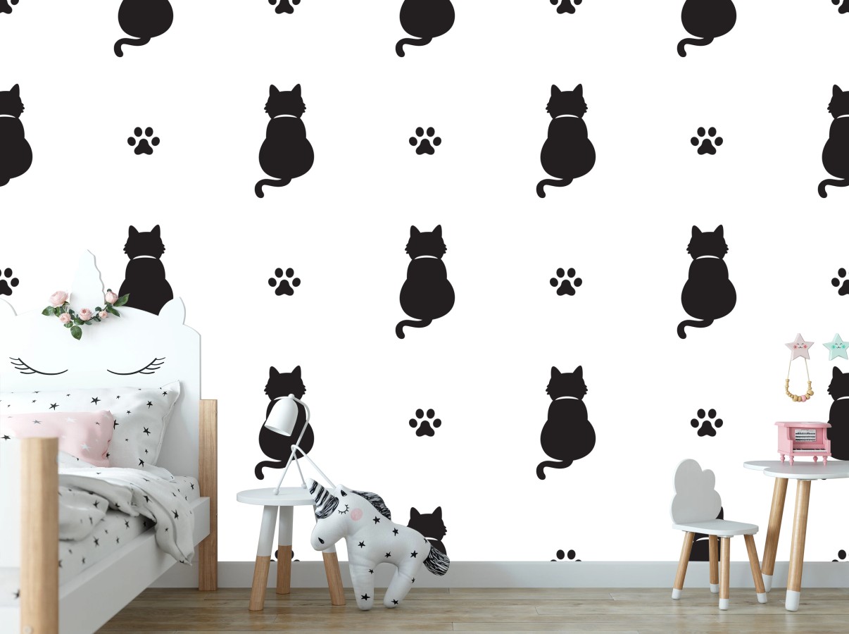 niedliches muster mit schwarzen katzensilhouetten und pfoten in einem klaren, minimalistischen design, perfekt für kinderzimmer, schlafzimmer und moderne wohnräume.MehrWeniger