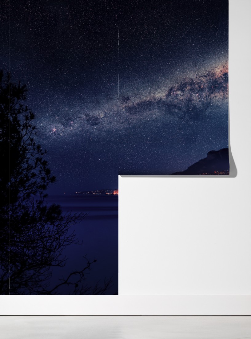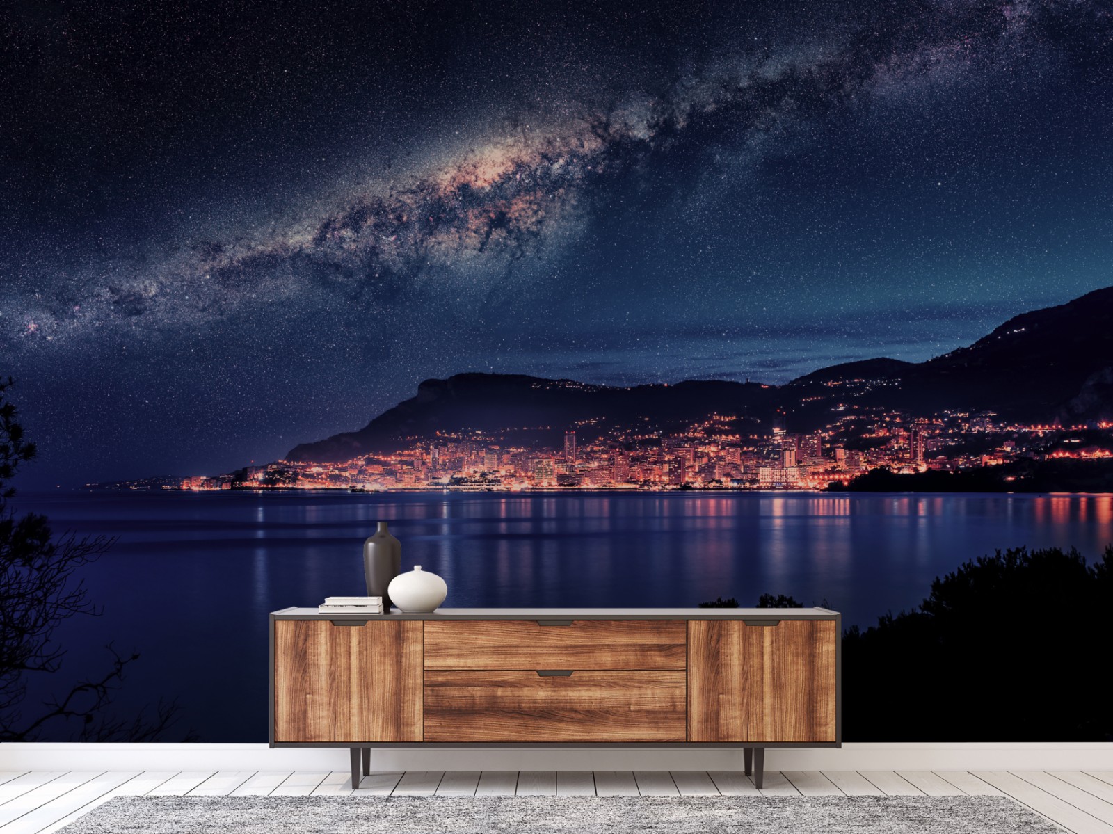 Atemberaubende nächtliche stadtlandschaft, in der die Milchstraße über einer leuchtenden Küstenlinie spannt und jedem Raum Tiefe und Atmosphäre verleiht.