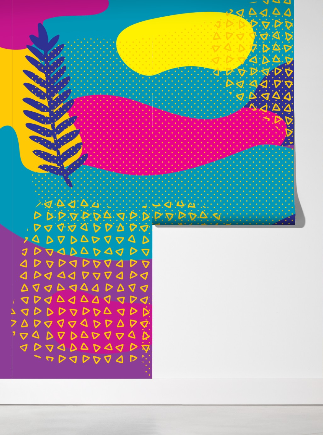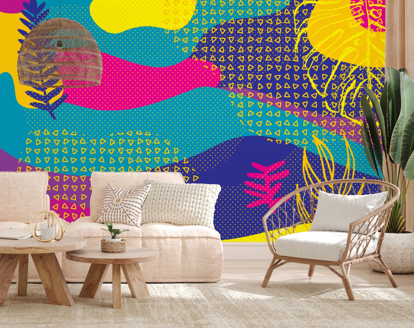 Kräftige, bunte abstrakte Grafik mit tropischen Formen und geometrischen Mustern, die jedem Raum lebendige Akzente verleiht.