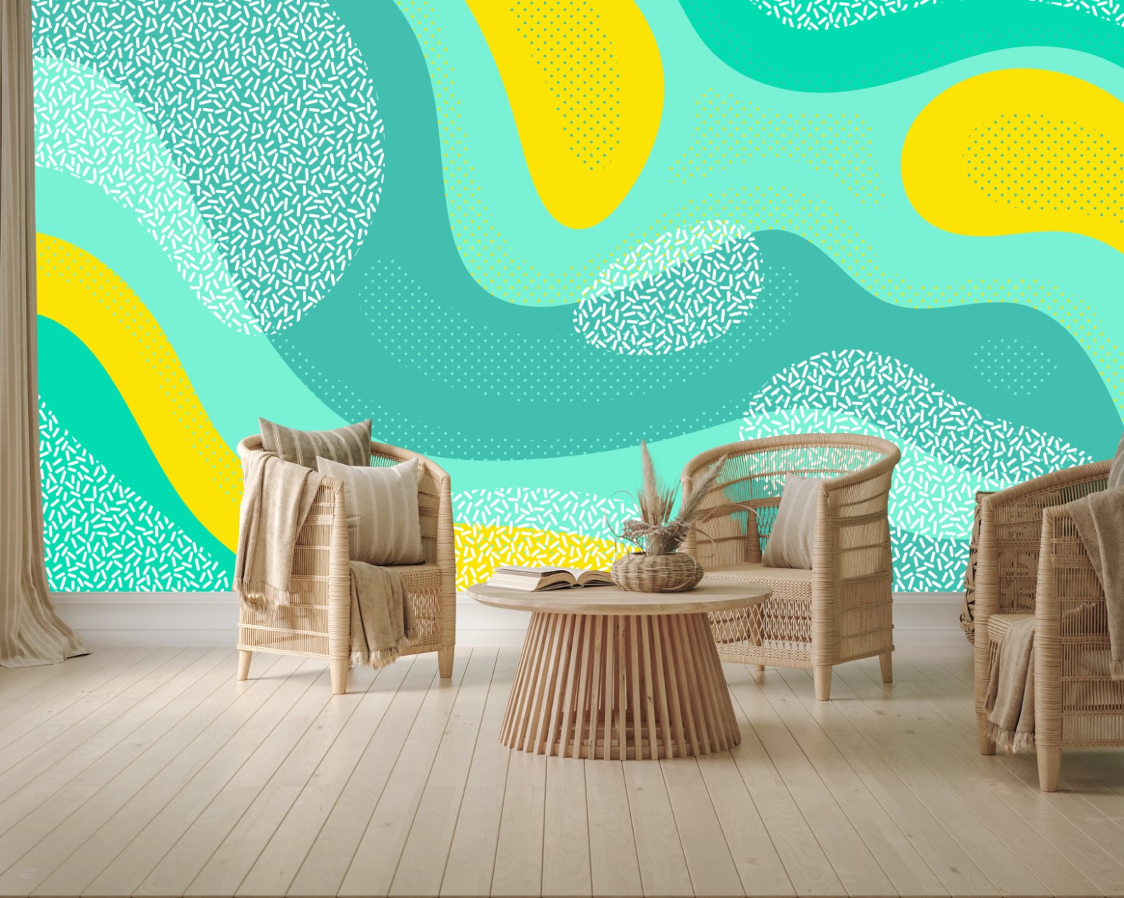 Lebendiges türkis-gelbes abstraktes Muster verleiht jedem Raum Energie und modernen Charakter.MehrWeniger