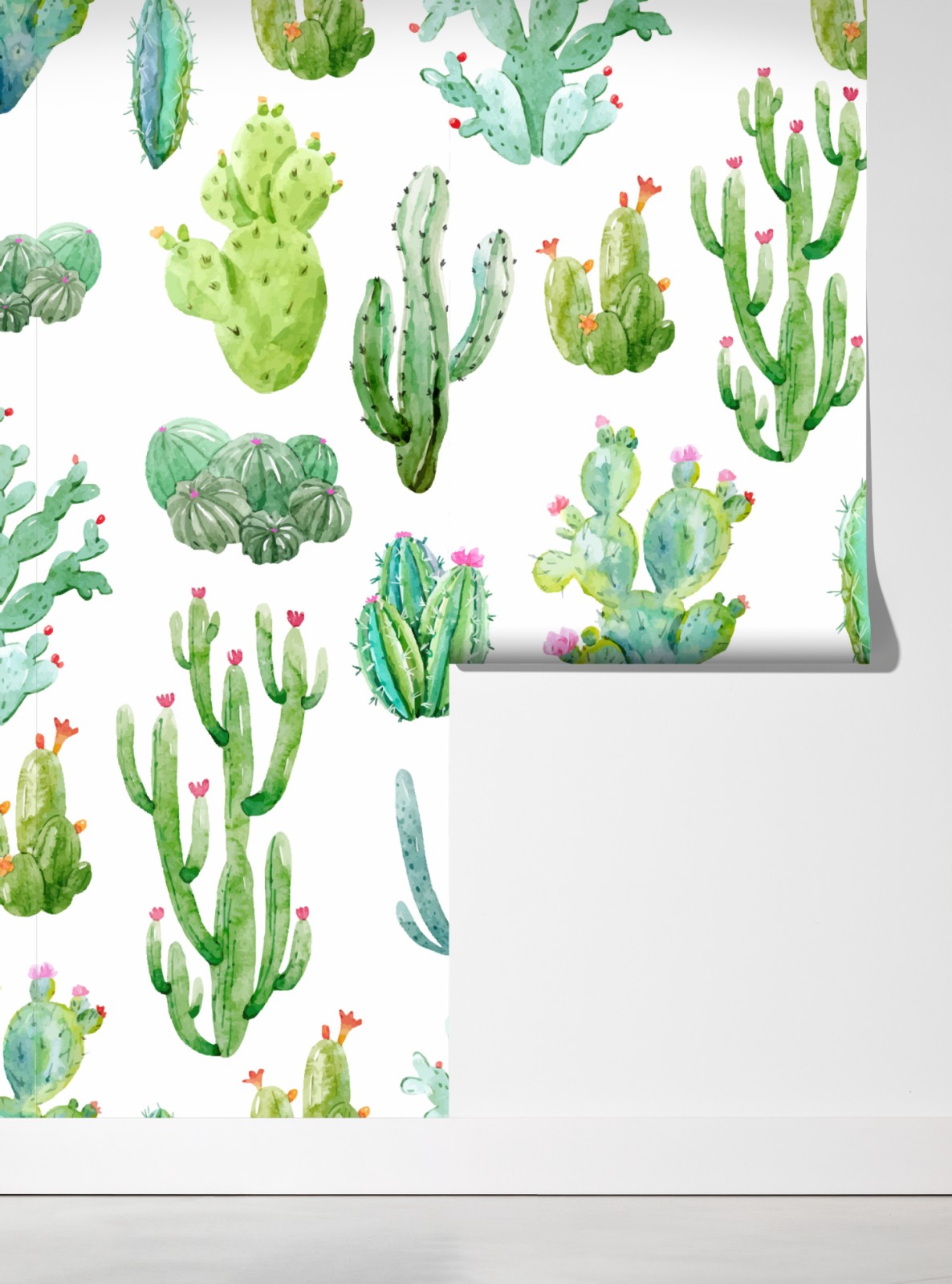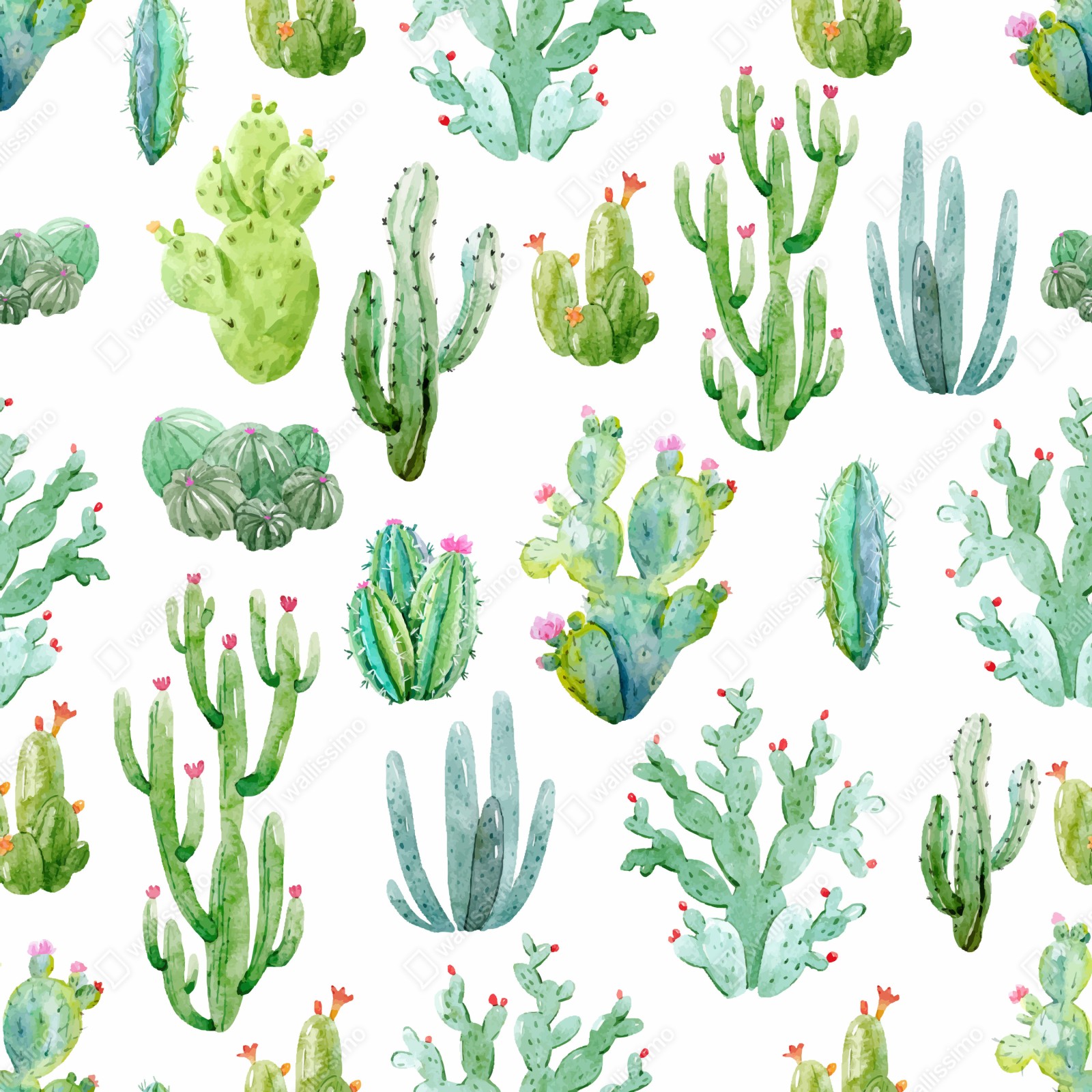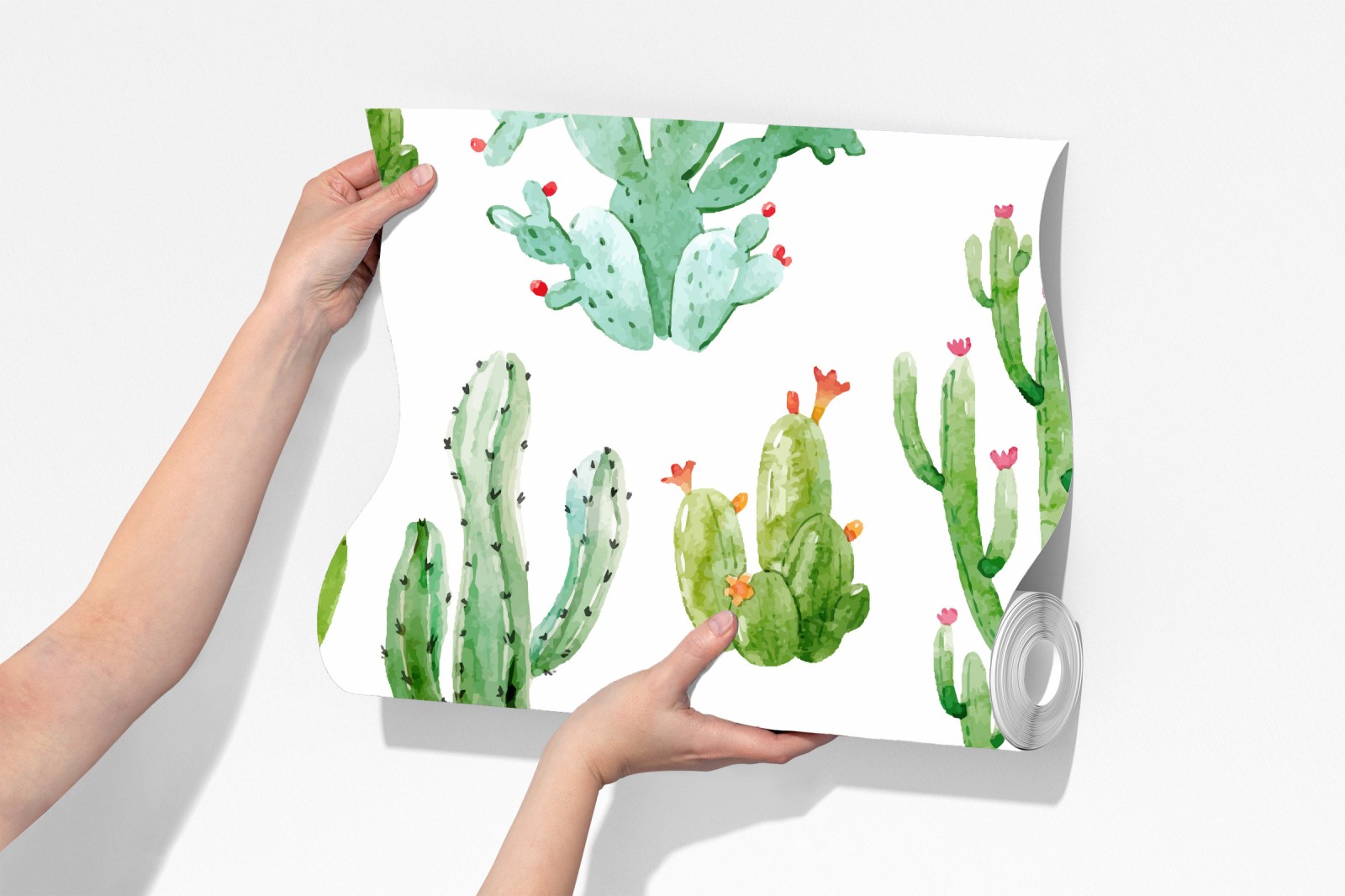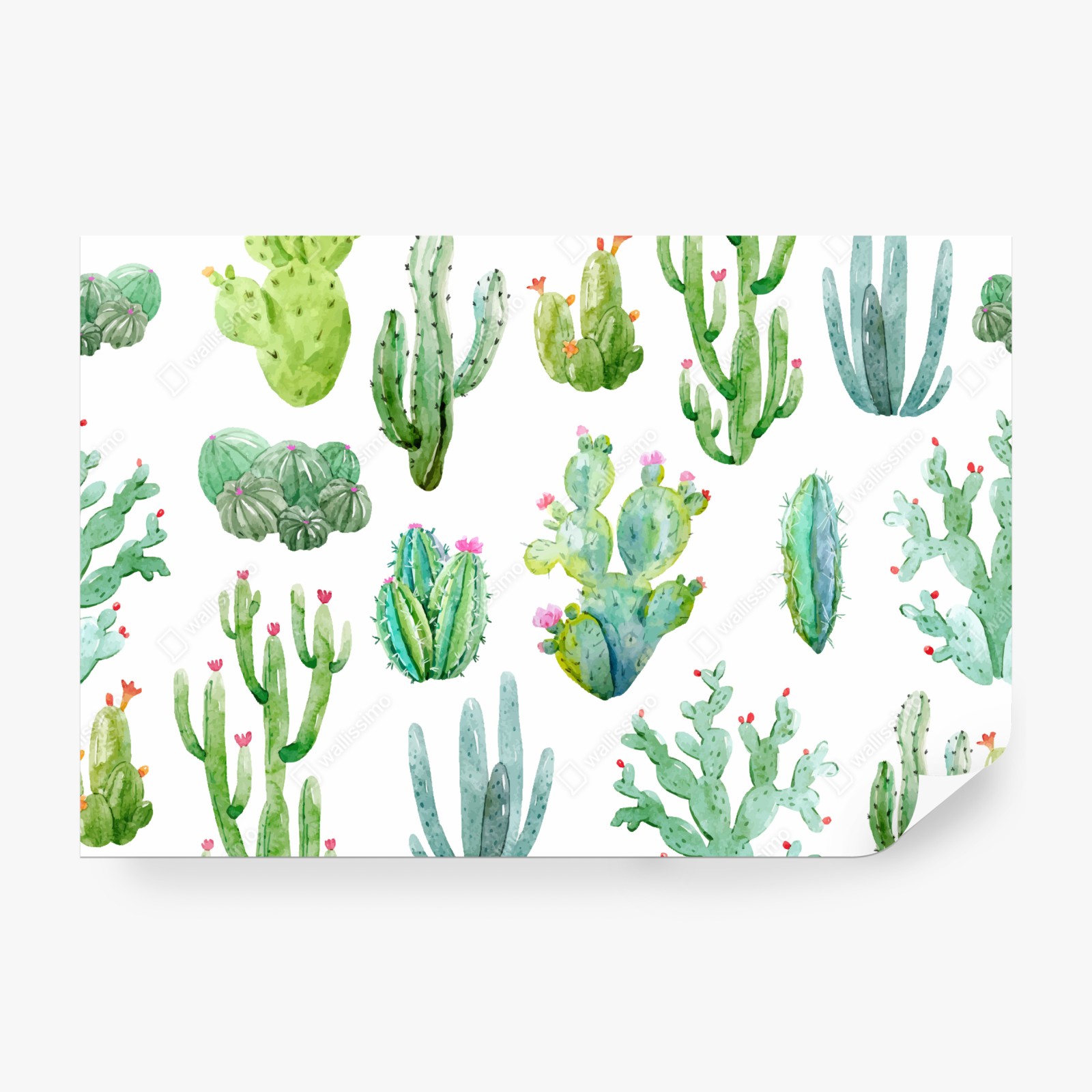 Feines Aquarell-Kaktusmuster bringt botanischen Charme und eine beruhigende Grünpalette an Ihre Wände, ideal für Kinderzimmer, Schlafzimmer oder Wohnräume.