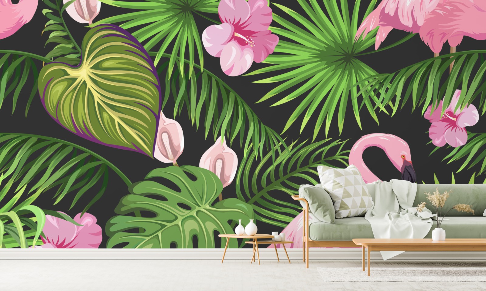 leuchtendes tropisches flamingo-design mit üppigen grünen palmen und rosa akzenten verleiht jedem raum einen verspielten boho-touch.