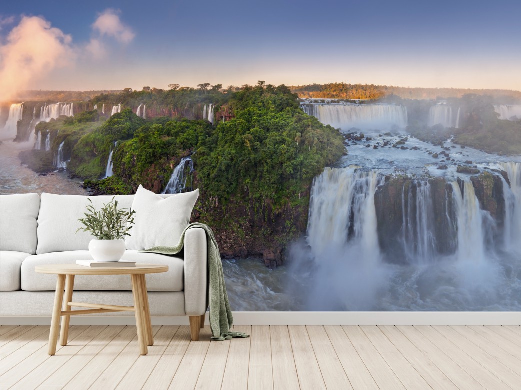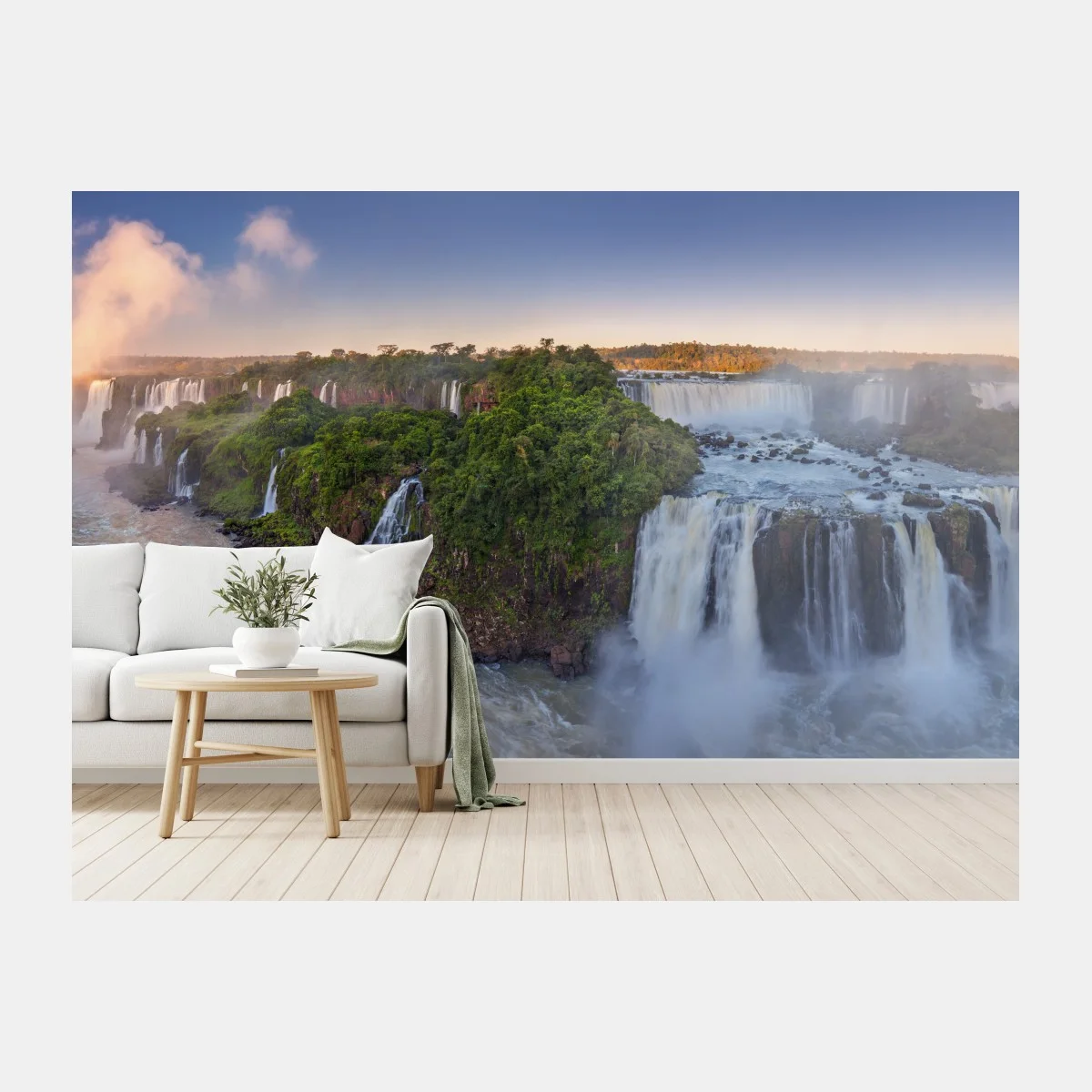 Fototapete Neblige panorama der wasserfälle im üppigen wald