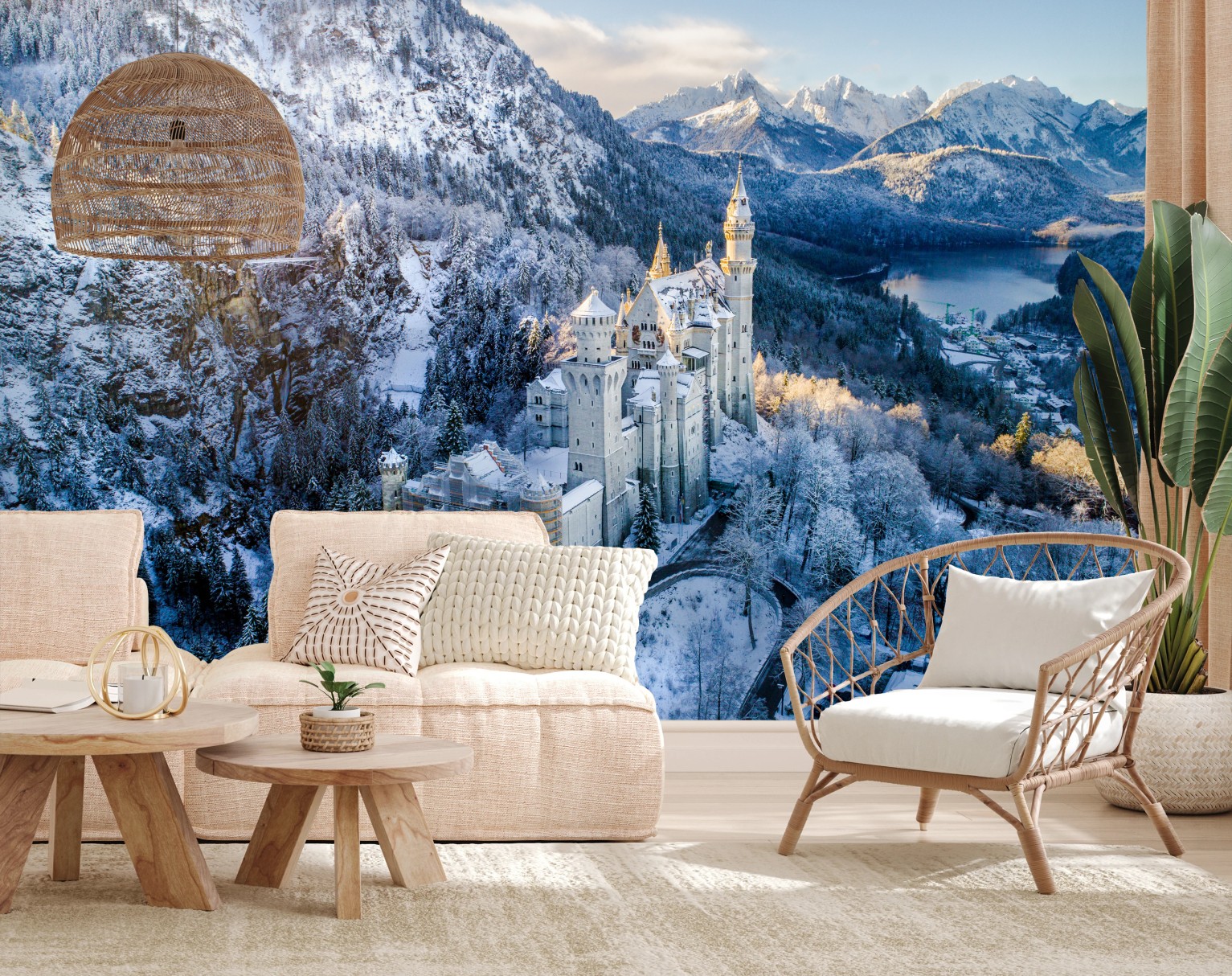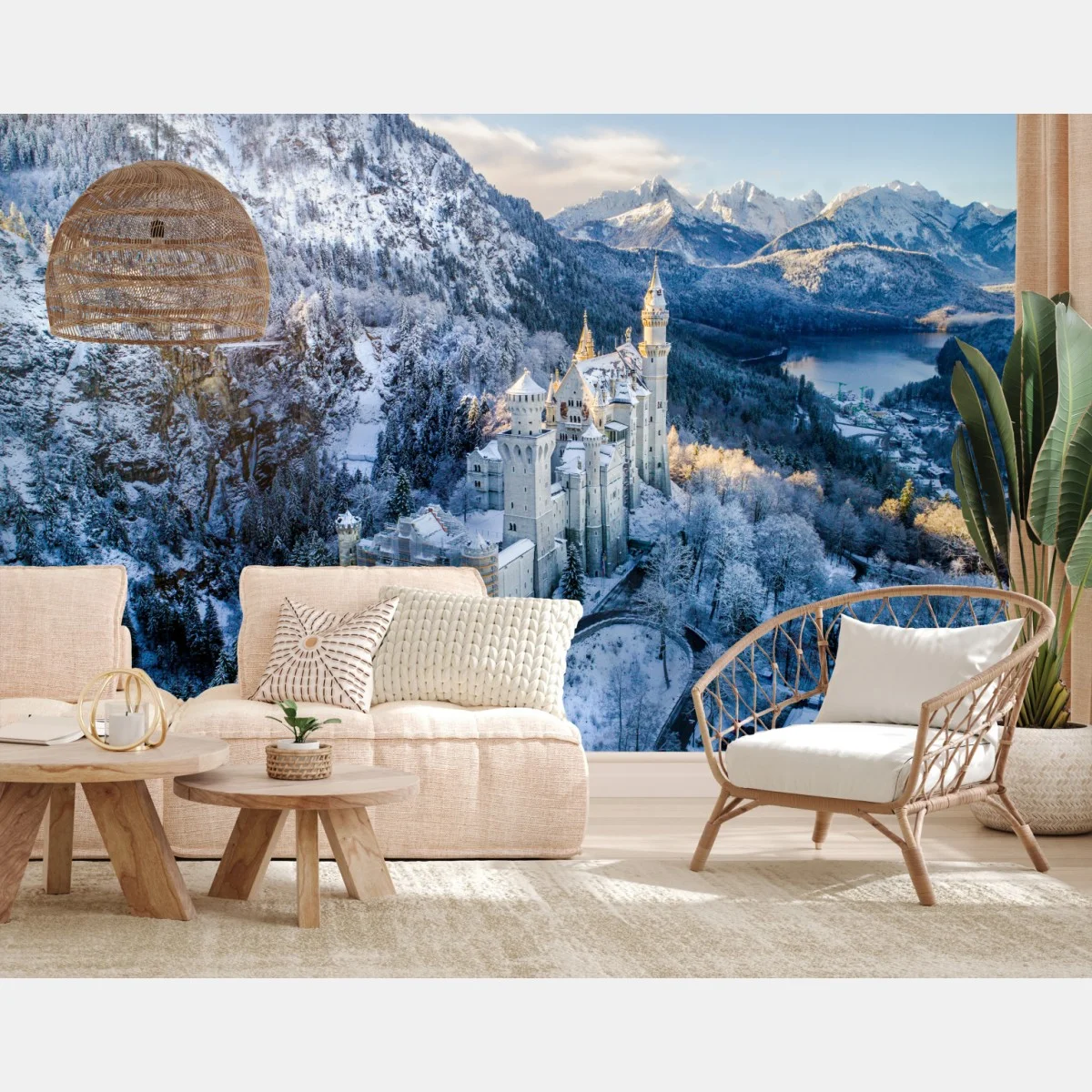 ein majestätisches schloss eingebettet in verschneite berge und einen ruhigen see, das jedem raum eine romantische winteratmosphäre verleiht.MehrWeniger