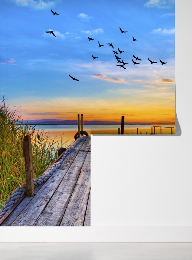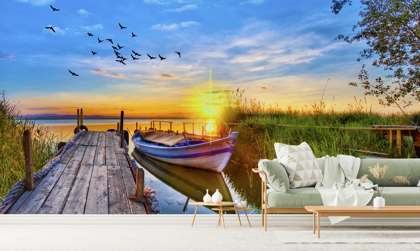 ruhige seelandschaft bei sonnenuntergang mit angelegtem boot und fliegenden vögeln, ideal um natürliche ruhe in ihr zuhause zu bringen.