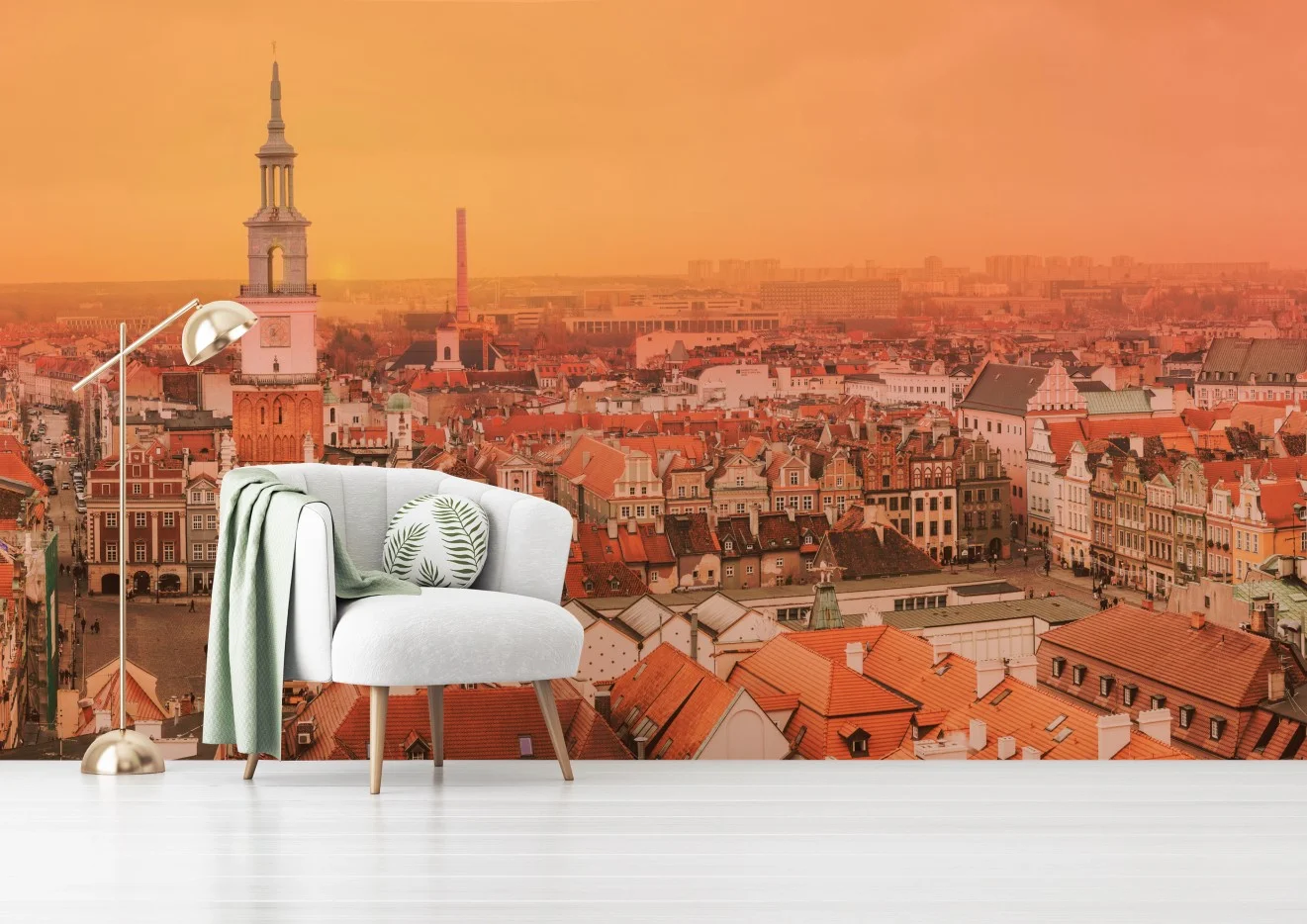 Fototapete Warmer sonnenuntergang über historischen stadtdächern