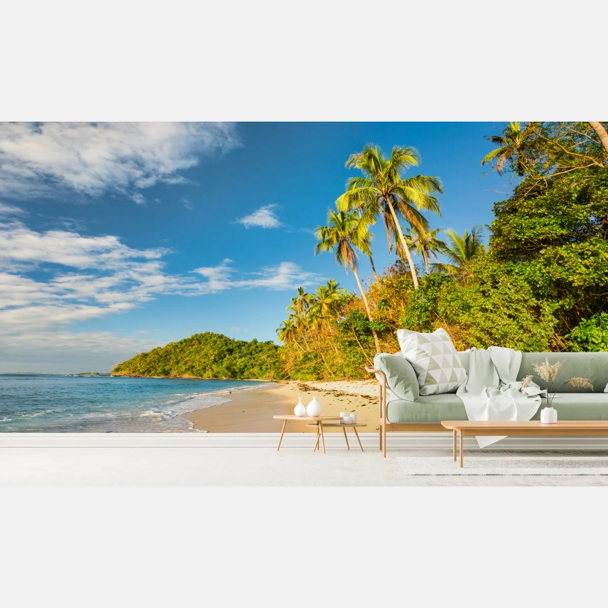 Bringen Sie die ruhige Atmosphäre einer tropischen Küste in Ihr Zuhause mit dieser lebendigen Strandaufnahme mit Palmen, weichem Sand und ruhigem türkisfarbenem Wasser.MehrWeniger