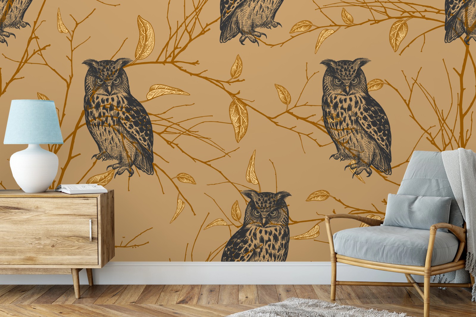 Fototapete Goldenes eulenmuster auf beigem hintergrund