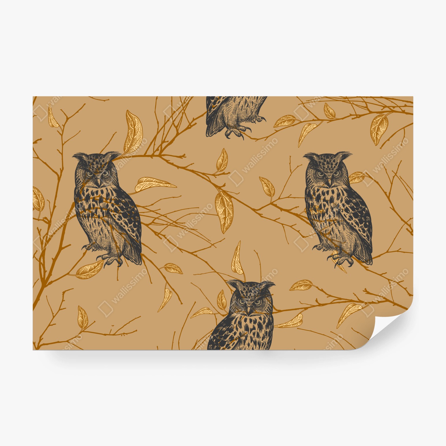 Fototapete Goldenes eulenmuster auf beigem hintergrund