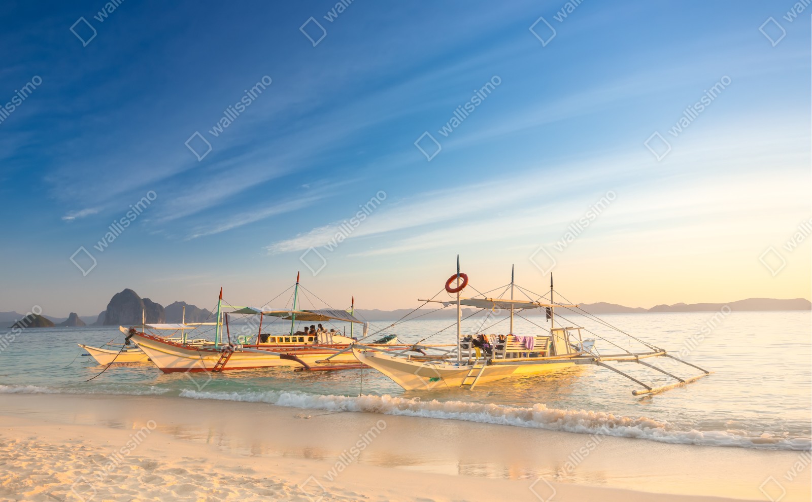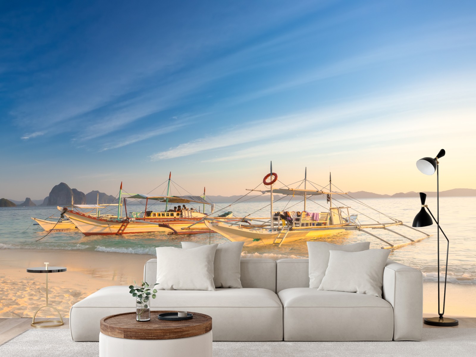 Fototapete tropischer strand bei sonnenuntergang mit booten – Wallnifity®