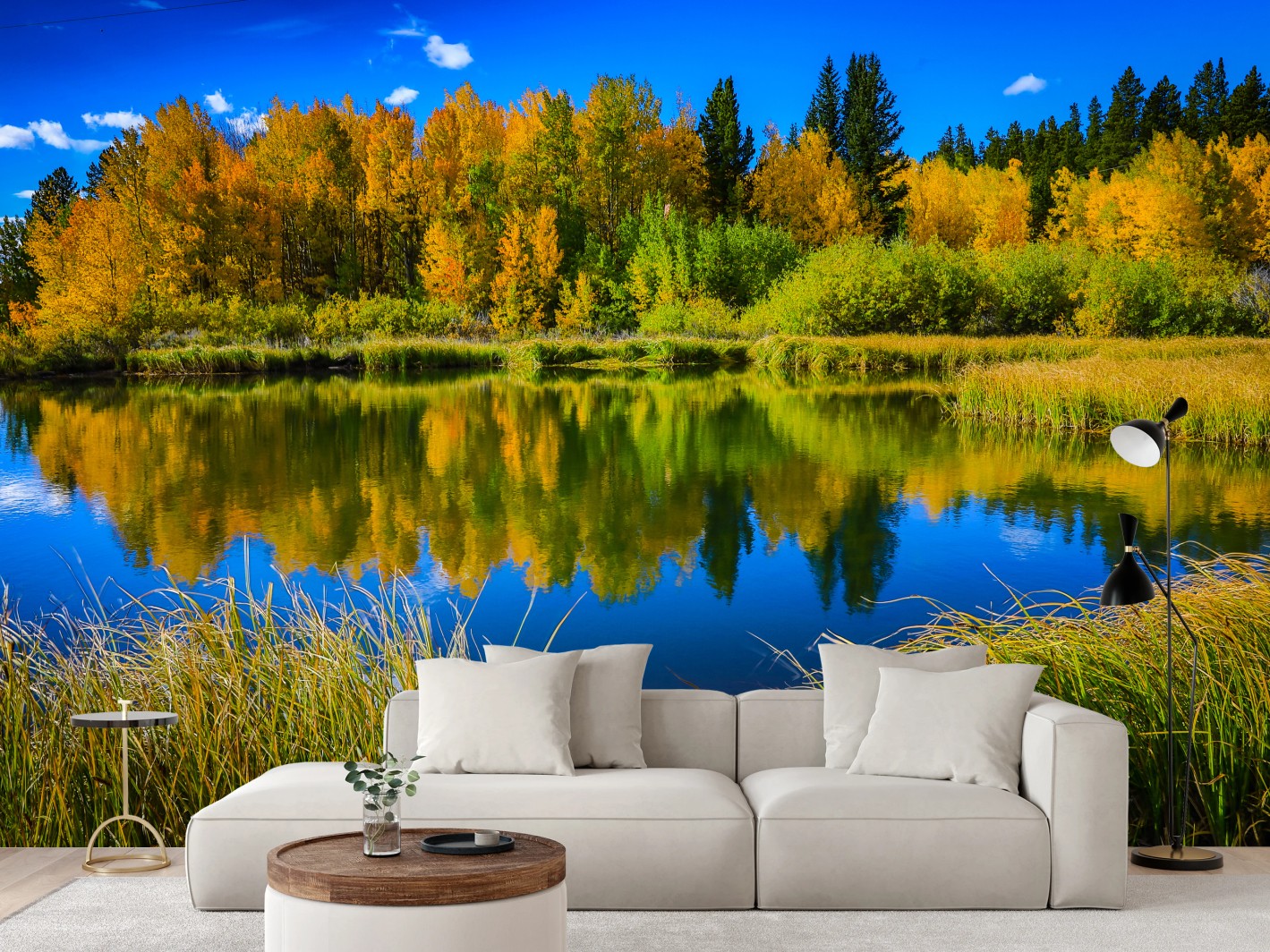 Fototapete Herbstbäume spiegeln sich in einem ruhigen see