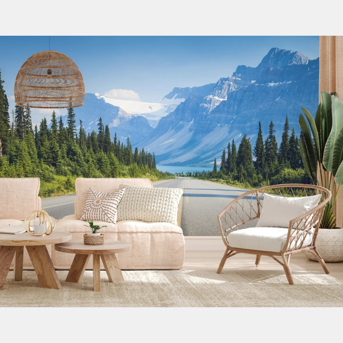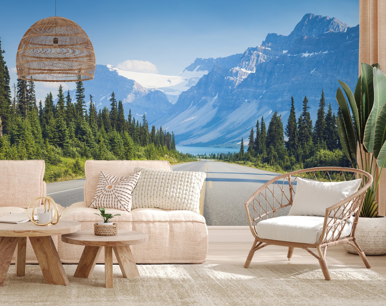 Fototapete Straße durch kiefernwald zu gletschersee und bergen