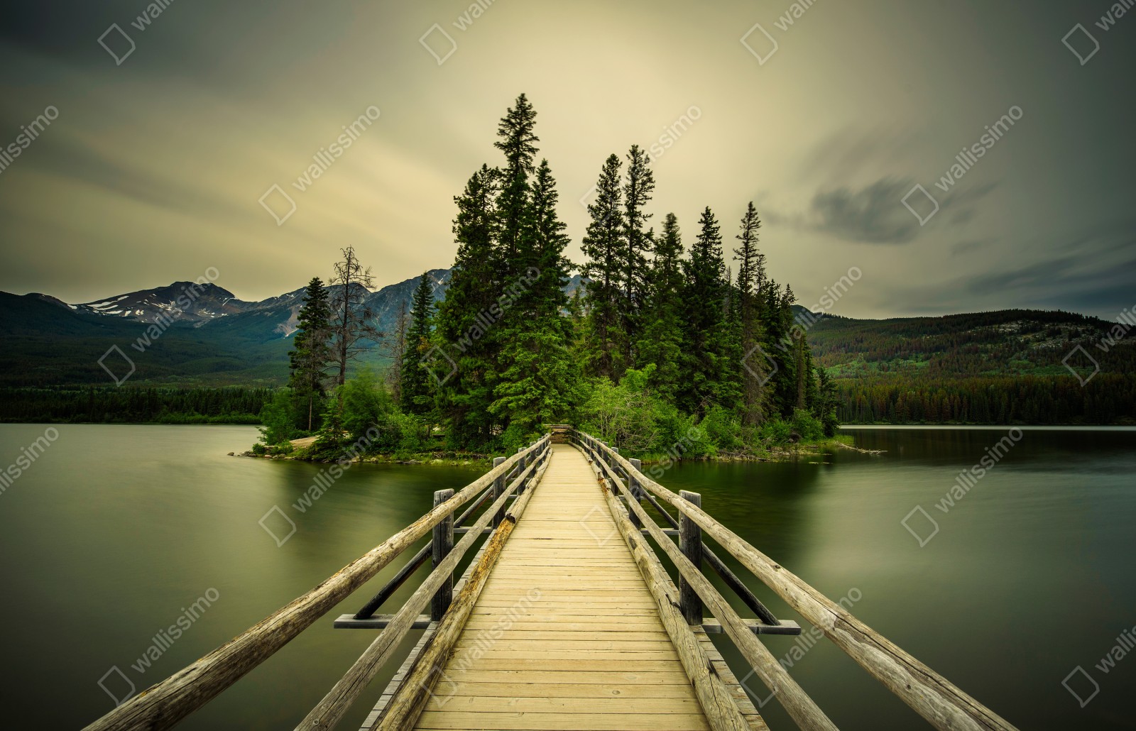 Langzeitbelichtung zeigt die ruhige Wasserfläche des Pyramid Lake und den hölzernen Steg zur bewaldeten Pyramid Island im Jasper National Park, perfekt zur Schaffung einer beruhigenden Atmosphäre in jedem Raum.